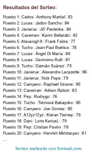 Lista de participantes: Dani Stephan El Shaarawy 82, Dani Aaron Wan-Bissaka 79, Carlos Abdou Diallo 79, Campero Abdoulaye Doucouré 81, Jaime Achraf HakimiL 79, A12yz12yz Adama Traoré 76, Caveman Adrien Rabiot 83, Campero Alban LafontL 79, Pep Alejandro Gómez 85, Javierux Aleksandar Kolarov 82, Alavarogf-9 Alessandro Florenzi 81, Dani Alessio Cragno 81, Caveman Alex Meret 78, Campero Alex Oxlade-Chamberlain 80, Alavarogf-9 Alex Teixeira 79, Campero Alex Telles 84, Tucho Alexandr Golovin 79, Javierux Alexandre Lacazette 86, Javierux Allan Saint-Maximin 79, Caveman Alphonse Areola 82, Carlos Ander Herrera 82, Salva André Gomes 80, Jaime André Onana 82, Carlos Andrea Belotti 82, Caveman Andrej Kramarić 83, Carlos Andrey Lunev 79, A12yz12yz Andriy Lunin 76, Pep Ángel Correa 82, Lucas Ángel Di María 86, Javierux Angeliño 79, Alavarogf-9 Ante Rebić 80, Carlos Anthony Martial 83, Salva Antonio Rüdiger 82, Carlos Arthur 84, Tucho Arthur Masuaku 76, A12yz12yz Arturo Vidal 84, Carlos Azpilicueta 84, Alavarogf-9 Badou Ndiaye 76, Jaime Benjamin Pavard 79, Pep Benjamin Verbič 79, Acid Bernd Leno 84, Campero Bruma 78, Acid Bruno Fernandes 85, A12yz12yz Capa 78, Pep Cédric Bakambu 82, Salva Chris Smalling 80, Dani Christian Luyindama 77, Carlos Christian Pulisic 79, Jaime Ciro Immobile 86, Caveman Clément Lenglet 85, Pep Cristian Pavón 78, Tucho Damián Suárez 79, Carlos Dani CeballosL 81, Tucho Daniele Rugani 82, Pep Danny da Costa 79, Dani David Abraham 78, Acid David Neres 81, Salva Davinson Sánchez 83, A12yz12yz Dayot Upamecano 77, Acid DeAndre Yedlin 76, Pep Denis Cheryshev 79, Carlos Denis Zakaria 78, Tucho Denzel Dumfries 78, A12yz12yz Deulofeu 80, A12yz12yz Diego Carlos 79, Tucho Divock Origi 78, Salva Dominik Livaković 79, Caveman Donny van de Beek 81, A12yz12yz Douglas Costa 84, Acid Éder Militão 81, Dani Edgar Manuel Guichón 78, Carlos Eduardo Salvio 80, Lucas Egidio Maestre Schetino 82, Javierux Eljero Elia 77, Carlos Elseid Hysaj 80, Caveman Emre Can 81, Pep Enzo Martín Riquero 79, Acid Eric Bailly 80, A12yz12yz Esteban Andrada 79, Lucas Éver Banega 83, Lucas Exequiel Palacios 77, Acid Ezequiel Lavezzi 79, Lucas Fabricio Bustos 77, Alavarogf-9 Ferland Mendy 80, Caveman Filip Kostić 82, Salva Franck Yannick Kessié 79, Alavarogf-9 Frank Acheampong 77, Alavarogf-9 Frank Fabra 77, Acid Fred 79, Carlos Frenkie de Jong 85, Caveman Gabriel Jesus 82, Pep Gabriel Paulista 82, Alavarogf-9 Gareth Bale 85, Carlos Gayà 80, Salva Gelson Martins 82, Javierux Geoffrey Kondogbia 81, Alavarogf-9 Georgiy Dzhikiya 78, Lucas Gerónimo Rulli 81, Lucas Giovani Lo Celso 83, Tucho Grimaldo 83, Campero Héctor Herrera 82, Campero Henrikh Mkhitaryan 81, Acid Henry Onyekuru 78, Acid Hirving Lozano 82, Dani Houssem Aouar 81, Jaime Ibrahima Konaté 79, Jaime Idrissa Gueye 83, Campero Iñaki Williams 82, Lucas Jadon Sancho 84, Pep Jaime Nicolás Frendado 81, Pep Jamie Vardy 82, Pep Jaume 76, Tucho Jean-Paul Boëtius 78, Acid Jean-Philippe Gbamin 79, Javierux Jérôme Boateng 84, Salva Jérôme Roussillon 82, Salva Jesse Lingard 82, A12yz12yz Jesús Navas 82, Javierux Jiří Pavlenka 84, Alavarogf-9 Joakim Mæhle 77, Campero João Cancelo 84, Dani João Félix 80, Lucas Joaquín Correa 80, Campero Joe Gomez 80, Caveman Joel Matip 82, Tucho Joel Robles 78, Jaime Jonathan Ikoné 78, Caveman Jordan Lukaku 77, Campero Jordan Pickford 83, Carlos Josef Martínez 81, Dani Joshua King 79, Acid Josué Chiamulera 83, Javierux Juan Cuadrado 83, Lucas Juan Musso 78, Javierux Juiano Mestres 82, Jaime Julian Brandt 84, Caveman Julian Draxler 83, Acid Junior Firpo 79, Alavarogf-9 Kai Havertz 84, Caveman Karim Bellarabi 82, Tucho Keita Baldé 80, Alavarogf-9 Kepa 84, Dani Kerem Demirbay 82, Carlos Kevin Mbabu 77, Tucho Kevin Vogt 80, A12yz12yz Kieran Tierney 76, Caveman Kingsley Coman 84, A12yz12yz Kostas Manolas 85, Dani Kyle Walker 84, Dani Lautaro Martínez 81, Lucas Leandro Paredes 80, Caveman Leon Bailey 82, Alavarogf-9 Leon Goretzka 84, Javierux Leonardo Pavoletti 78, Lucas Leonardo Sigali 79, Tucho Leroy Sané 86, Lucas Lisandro López 81, Lucas Lisandro Martínez 77, Jaime Lorenzo Pellegrini 79, Dani Loris KariusL 79, Alavarogf-9 Lucas Hernández 84, Salva Lucas Moura 83, Campero Luis Muriel 80, Alavarogf-9 Łukasz Fabiański 82, Alavarogf-9 Manuel Akanji 83, Tucho Manuel Lazzari 79, Javierux Marcano 79, Lucas Marcos Acuña 81, Salva Marcus Rashford 83, Javierux Mariano 79, Jaime Mario Hermoso 80, Pep Mário Rui 79, Campero Marouane Fellaini 76, Dani Martin ØdegaardL 78, A12yz12yz Mateo Kovačić 82, Salva Matías Vargas 77, Caveman Matías Zaracho 78, Salva Mattia Perin 82, Salva M'Baye Niang 77, Dani Memphis Depay 84, A12yz12yz Michail Antonio 78, Tucho Morales 81, Jaime Moussa Dembélé 79, Alavarogf-9 Moussa Marega 80, Acid Moussa Sissoko 81, Salva Nabil Fekir 84, Campero Naby Keïta 82, Dani Nacho Fernández 82, Jaime Nathan Aké 81, Lucas Nélson Semedo 82, Javierux Nick Pope 79, Jaime Nico Schulz 82, Lucas Nicolás Otamendi 83, Campero Nicolas Pépé 83, Lucas Nicolás Tagliafico 82, Tucho Ogenyi Onazi 76, Carlos Ousmane Dembélé 84, Jaime Oyarzabal 82, Pep Paulinho 84, Jaime Pierluigi Gollini 76, Tucho Piotr Zieliński 81, Carlos Presnel Kimpembe 82, Javierux Quincy Promes 82, Javierux Radja Nainggolan 83, Campero Raphaël Varane 85, Salva Raphinha 79, Caveman Renato Sanches 76, Salva Renzo Saravia 78, Caveman Ricardo Pereira 82, Salva Richarlison 79, Alavarogf-9 Riyad Mahrez 84, A12yz12yz Rodrigo 83, Pep Rodrygo 76, A12yz12yz Ronaldo Esler 78, Campero Rúben Dias 80, A12yz12yz Ryan Fraser 81, A12yz12yz Sander Berge 79, Acid Santiago Arias 79, Javierux Sebastian Giovinco 81, A12yz12yz Segundo Mandíquez 81, Campero Serge Gnabry 84, Dani Sergi Roberto 82, Pep Sergio Asenjo 82, Pep Sokratis 84, Dani Stanislav Lobotka 79, Jaime Steven Bergwijn 82, Javierux Taison 82, Jaime Tanguy Ndombele 81, Campero Theo Hernández 76, Caveman Thilo Kehrer 79, Pep Thomas Delaney 82, Alavarogf-9 Thomas Meunier 82