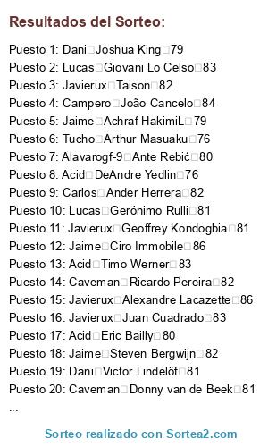 Lista de participantes: Dani Stephan El Shaarawy 82, Dani Aaron Wan-Bissaka 79, Carlos Abdou Diallo 79, Campero Abdoulaye Doucouré 81, Jaime Achraf HakimiL 79, A12yz12yz Adama Traoré 76, Caveman Adrien Rabiot 83, Campero Alban LafontL 79, Pep Alejandro Gómez 85, Javierux Aleksandar Kolarov 82, Alavarogf-9 Alessandro Florenzi 81, Dani Alessio Cragno 81, Caveman Alex Meret 78, Campero Alex Oxlade-Chamberlain 80, Alavarogf-9 Alex Teixeira 79, Campero Alex Telles 84, Tucho Alexandr Golovin 79, Javierux Alexandre Lacazette 86, Javierux Allan Saint-Maximin 79, Caveman Alphonse Areola 82, Carlos Ander Herrera 82, Salva André Gomes 80, Jaime André Onana 82, Carlos Andrea Belotti 82, Caveman Andrej Kramarić 83, Carlos Andrey Lunev 79, A12yz12yz Andriy Lunin 76, Pep Ángel Correa 82, Lucas Ángel Di María 86, Javierux Angeliño 79, Alavarogf-9 Ante Rebić 80, Carlos Anthony Martial 83, Salva Antonio Rüdiger 82, Carlos Arthur 84, Tucho Arthur Masuaku 76, A12yz12yz Arturo Vidal 84, Carlos Azpilicueta 84, Alavarogf-9 Badou Ndiaye 76, Jaime Benjamin Pavard 79, Pep Benjamin Verbič 79, Acid Bernd Leno 84, Campero Bruma 78, Acid Bruno Fernandes 85, A12yz12yz Capa 78, Pep Cédric Bakambu 82, Salva Chris Smalling 80, Dani Christian Luyindama 77, Carlos Christian Pulisic 79, Jaime Ciro Immobile 86, Caveman Clément Lenglet 85, Pep Cristian Pavón 78, Tucho Damián Suárez 79, Carlos Dani CeballosL 81, Tucho Daniele Rugani 82, Pep Danny da Costa 79, Dani David Abraham 78, Acid David Neres 81, Salva Davinson Sánchez 83, A12yz12yz Dayot Upamecano 77, Acid DeAndre Yedlin 76, Pep Denis Cheryshev 79, Carlos Denis Zakaria 78, Tucho Denzel Dumfries 78, A12yz12yz Deulofeu 80, A12yz12yz Diego Carlos 79, Tucho Divock Origi 78, Salva Dominik Livaković 79, Caveman Donny van de Beek 81, A12yz12yz Douglas Costa 84, Acid Éder Militão 81, Dani Edgar Manuel Guichón 78, Carlos Eduardo Salvio 80, Lucas Egidio Maestre Schetino 82, Javierux Eljero Elia 77, Carlos Elseid Hysaj 80, Caveman Emre Can 81, Pep Enzo Martín Riquero 79, Acid Eric Bailly 80, A12yz12yz Esteban Andrada 79, Lucas Éver Banega 83, Lucas Exequiel Palacios 77, Acid Ezequiel Lavezzi 79, Lucas Fabricio Bustos 77, Alavarogf-9 Ferland Mendy 80, Caveman Filip Kostić 82, Salva Franck Yannick Kessié 79, Alavarogf-9 Frank Acheampong 77, Alavarogf-9 Frank Fabra 77, Acid Fred 79, Carlos Frenkie de Jong 85, Caveman Gabriel Jesus 82, Pep Gabriel Paulista 82, Alavarogf-9 Gareth Bale 85, Carlos Gayà 80, Salva Gelson Martins 82, Javierux Geoffrey Kondogbia 81, Alavarogf-9 Georgiy Dzhikiya 78, Lucas Gerónimo Rulli 81, Lucas Giovani Lo Celso 83, Tucho Grimaldo 83, Campero Héctor Herrera 82, Campero Henrikh Mkhitaryan 81, Acid Henry Onyekuru 78, Acid Hirving Lozano 82, Dani Houssem Aouar 81, Jaime Ibrahima Konaté 79, Jaime Idrissa Gueye 83, Campero Iñaki Williams 82, Lucas Jadon Sancho 84, Pep Jaime Nicolás Frendado 81, Pep Jamie Vardy 82, Pep Jaume 76, Tucho Jean-Paul Boëtius 78, Acid Jean-Philippe Gbamin 79, Javierux Jérôme Boateng 84, Salva Jérôme Roussillon 82, Salva Jesse Lingard 82, A12yz12yz Jesús Navas 82, Javierux Jiří Pavlenka 84, Alavarogf-9 Joakim Mæhle 77, Campero João Cancelo 84, Dani João Félix 80, Lucas Joaquín Correa 80, Campero Joe Gomez 80, Caveman Joel Matip 82, Tucho Joel Robles 78, Jaime Jonathan Ikoné 78, Caveman Jordan Lukaku 77, Campero Jordan Pickford 83, Carlos Josef Martínez 81, Dani Joshua King 79, Acid Josué Chiamulera 83, Javierux Juan Cuadrado 83, Lucas Juan Musso 78, Javierux Juiano Mestres 82, Jaime Julian Brandt 84, Caveman Julian Draxler 83, Acid Junior Firpo 79, Alavarogf-9 Kai Havertz 84, Caveman Karim Bellarabi 82, Tucho Keita Baldé 80, Alavarogf-9 Kepa 84, Dani Kerem Demirbay 82, Carlos Kevin Mbabu 77, Tucho Kevin Vogt 80, A12yz12yz Kieran Tierney 76, Caveman Kingsley Coman 84, A12yz12yz Kostas Manolas 85, Dani Kyle Walker 84, Dani Lautaro Martínez 81, Lucas Leandro Paredes 80, Caveman Leon Bailey 82, Alavarogf-9 Leon Goretzka 84, Javierux Leonardo Pavoletti 78, Lucas Leonardo Sigali 79, Tucho Leroy Sané 86, Lucas Lisandro López 81, Lucas Lisandro Martínez 77, Jaime Lorenzo Pellegrini 79, Dani Loris KariusL 79, Alavarogf-9 Lucas Hernández 84, Salva Lucas Moura 83, Campero Luis Muriel 80, Alavarogf-9 Łukasz Fabiański 82, Alavarogf-9 Manuel Akanji 83, Tucho Manuel Lazzari 79, Javierux Marcano 79, Lucas Marcos Acuña 81, Salva Marcus Rashford 83, Javierux Mariano 79, Jaime Mario Hermoso 80, Pep Mário Rui 79, Campero Marouane Fellaini 76, Dani Martin ØdegaardL 78, A12yz12yz Mateo Kovačić 82, Salva Matías Vargas 77, Caveman Matías Zaracho 78, Salva Mattia Perin 82, Salva M'Baye Niang 77, Dani Memphis Depay 84, A12yz12yz Michail Antonio 78, Tucho Morales 81, Jaime Moussa Dembélé 79, Alavarogf-9 Moussa Marega 80, Acid Moussa Sissoko 81, Salva Nabil Fekir 84, Campero Naby Keïta 82, Dani Nacho Fernández 82, Jaime Nathan Aké 81, Lucas Nélson Semedo 82, Javierux Nick Pope 79, Jaime Nico Schulz 82, Lucas Nicolás Otamendi 83, Campero Nicolas Pépé 83, Lucas Nicolás Tagliafico 82, Tucho Ogenyi Onazi 76, Carlos Ousmane Dembélé 84, Jaime Oyarzabal 82, Pep Paulinho 84, Jaime Pierluigi Gollini 76, Tucho Piotr Zieliński 81, Carlos Presnel Kimpembe 82, Javierux Quincy Promes 82, Javierux Radja Nainggolan 83, Campero Raphaël Varane 85, Salva Raphinha 79, Caveman Renato Sanches 76, Salva Renzo Saravia 78, Caveman Ricardo Pereira 82, Salva Richarlison 79, Alavarogf-9 Riyad Mahrez 84, A12yz12yz Rodrigo 83, Pep Rodrygo 76, A12yz12yz Ronaldo Esler 78, Campero Rúben Dias 80, A12yz12yz Ryan Fraser 81, A12yz12yz Sander Berge 79, Acid Santiago Arias 79, Javierux Sebastian Giovinco 81, A12yz12yz Segundo Mandíquez 81, Campero Serge Gnabry 84, Dani Sergi Roberto 82, Pep Sergio Asenjo 82, Pep Sokratis 84, Dani Stanislav Lobotka 79, Jaime Steven Bergwijn 82, Javierux Taison 82, Jaime Tanguy Ndombele 81, Campero Theo Hernández 76, Caveman Thilo Kehrer 79, Pep Thomas Delaney 82, Alavarogf-9 Thomas Meunier 82