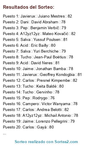 Lista de participantes: Dani Stephan El Shaarawy 82, Dani Aaron Wan-Bissaka 79, Carlos Abdou Diallo 79, Campero Abdoulaye Doucouré 81, Jaime Achraf HakimiL 79, A12yz12yz Adama Traoré 76, Caveman Adrien Rabiot 83, Campero Alban LafontL 79, Pep Alejandro Gómez 85, Javierux Aleksandar Kolarov 82, Alavarogf-9 Alessandro Florenzi 81, Dani Alessio Cragno 81, Caveman Alex Meret 78, Campero Alex Oxlade-Chamberlain 80, Alavarogf-9 Alex Teixeira 79, Campero Alex Telles 84, Tucho Alexandr Golovin 79, Javierux Alexandre Lacazette 86, Javierux Allan Saint-Maximin 79, Caveman Alphonse Areola 82, Carlos Ander Herrera 82, Salva André Gomes 80, Jaime André Onana 82, Carlos Andrea Belotti 82, Caveman Andrej Kramarić 83, Carlos Andrey Lunev 79, A12yz12yz Andriy Lunin 76, Pep Ángel Correa 82, Lucas Ángel Di María 86, Javierux Angeliño 79, Alavarogf-9 Ante Rebić 80, Carlos Anthony Martial 83, Salva Antonio Rüdiger 82, Carlos Arthur 84, Tucho Arthur Masuaku 76, A12yz12yz Arturo Vidal 84, Carlos Azpilicueta 84, Alavarogf-9 Badou Ndiaye 76, Jaime Benjamin Pavard 79, Pep Benjamin Verbič 79, Acid Bernd Leno 84, Campero Bruma 78, Acid Bruno Fernandes 85, A12yz12yz Capa 78, Pep Cédric Bakambu 82, Salva Chris Smalling 80, Dani Christian Luyindama 77, Carlos Christian Pulisic 79, Jaime Ciro Immobile 86, Caveman Clément Lenglet 85, Pep Cristian Pavón 78, Tucho Damián Suárez 79, Carlos Dani CeballosL 81, Tucho Daniele Rugani 82, Pep Danny da Costa 79, Dani David Abraham 78, Acid David Neres 81, Salva Davinson Sánchez 83, A12yz12yz Dayot Upamecano 77, Acid DeAndre Yedlin 76, Pep Denis Cheryshev 79, Carlos Denis Zakaria 78, Tucho Denzel Dumfries 78, A12yz12yz Deulofeu 80, A12yz12yz Diego Carlos 79, Tucho Divock Origi 78, Salva Dominik Livaković 79, Caveman Donny van de Beek 81, A12yz12yz Douglas Costa 84, Acid Éder Militão 81, Dani Edgar Manuel Guichón 78, Carlos Eduardo Salvio 80, Lucas Egidio Maestre Schetino 82, Javierux Eljero Elia 77, Carlos Elseid Hysaj 80, Caveman Emre Can 81, Pep Enzo Martín Riquero 79, Acid Eric Bailly 80, A12yz12yz Esteban Andrada 79, Lucas Éver Banega 83, Lucas Exequiel Palacios 77, Acid Ezequiel Lavezzi 79, Lucas Fabricio Bustos 77, Alavarogf-9 Ferland Mendy 80, Caveman Filip Kostić 82, Salva Franck Yannick Kessié 79, Alavarogf-9 Frank Acheampong 77, Alavarogf-9 Frank Fabra 77, Acid Fred 79, Carlos Frenkie de Jong 85, Caveman Gabriel Jesus 82, Pep Gabriel Paulista 82, Alavarogf-9 Gareth Bale 85, Carlos Gayà 80, Salva Gelson Martins 82, Javierux Geoffrey Kondogbia 81, Alavarogf-9 Georgiy Dzhikiya 78, Lucas Gerónimo Rulli 81, Lucas Giovani Lo Celso 83, Tucho Grimaldo 83, Campero Héctor Herrera 82, Campero Henrikh Mkhitaryan 81, Acid Henry Onyekuru 78, Acid Hirving Lozano 82, Dani Houssem Aouar 81, Jaime Ibrahima Konaté 79, Jaime Idrissa Gueye 83, Campero Iñaki Williams 82, Lucas Jadon Sancho 84, Pep Jaime Nicolás Frendado 81, Pep Jamie Vardy 82, Pep Jaume 76, Tucho Jean-Paul Boëtius 78, Acid Jean-Philippe Gbamin 79, Javierux Jérôme Boateng 84, Salva Jérôme Roussillon 82, Salva Jesse Lingard 82, A12yz12yz Jesús Navas 82, Javierux Jiří Pavlenka 84, Alavarogf-9 Joakim Mæhle 77, Campero João Cancelo 84, Dani João Félix 80, Lucas Joaquín Correa 80, Campero Joe Gomez 80, Caveman Joel Matip 82, Tucho Joel Robles 78, Jaime Jonathan Ikoné 78, Caveman Jordan Lukaku 77, Campero Jordan Pickford 83, Carlos Josef Martínez 81, Dani Joshua King 79, Acid Josué Chiamulera 83, Javierux Juan Cuadrado 83, Lucas Juan Musso 78, Javierux Juiano Mestres 82, Jaime Julian Brandt 84, Caveman Julian Draxler 83, Acid Junior Firpo 79, Alavarogf-9 Kai Havertz 84, Caveman Karim Bellarabi 82, Tucho Keita Baldé 80, Alavarogf-9 Kepa 84, Dani Kerem Demirbay 82, Carlos Kevin Mbabu 77, Tucho Kevin Vogt 80, A12yz12yz Kieran Tierney 76, Caveman Kingsley Coman 84, A12yz12yz Kostas Manolas 85, Dani Kyle Walker 84, Dani Lautaro Martínez 81, Lucas Leandro Paredes 80, Caveman Leon Bailey 82, Alavarogf-9 Leon Goretzka 84, Javierux Leonardo Pavoletti 78, Lucas Leonardo Sigali 79, Tucho Leroy Sané 86, Lucas Lisandro López 81, Lucas Lisandro Martínez 77, Jaime Lorenzo Pellegrini 79, Dani Loris KariusL 79, Alavarogf-9 Lucas Hernández 84, Salva Lucas Moura 83, Campero Luis Muriel 80, Alavarogf-9 Łukasz Fabiański 82, Alavarogf-9 Manuel Akanji 83, Tucho Manuel Lazzari 79, Javierux Marcano 79, Lucas Marcos Acuña 81, Salva Marcus Rashford 83, Javierux Mariano 79, Jaime Mario Hermoso 80, Pep Mário Rui 79, Campero Marouane Fellaini 76, Dani Martin ØdegaardL 78, A12yz12yz Mateo Kovačić 82, Salva Matías Vargas 77, Caveman Matías Zaracho 78, Salva Mattia Perin 82, Salva M'Baye Niang 77, Dani Memphis Depay 84, A12yz12yz Michail Antonio 78, Tucho Morales 81, Jaime Moussa Dembélé 79, Alavarogf-9 Moussa Marega 80, Acid Moussa Sissoko 81, Salva Nabil Fekir 84, Campero Naby Keïta 82, Dani Nacho Fernández 82, Jaime Nathan Aké 81, Lucas Nélson Semedo 82, Javierux Nick Pope 79, Jaime Nico Schulz 82, Lucas Nicolás Otamendi 83, Campero Nicolas Pépé 83, Lucas Nicolás Tagliafico 82, Tucho Ogenyi Onazi 76, Carlos Ousmane Dembélé 84, Jaime Oyarzabal 82, Pep Paulinho 84, Jaime Pierluigi Gollini 76, Tucho Piotr Zieliński 81, Carlos Presnel Kimpembe 82, Javierux Quincy Promes 82, Javierux Radja Nainggolan 83, Campero Raphaël Varane 85, Salva Raphinha 79, Caveman Renato Sanches 76, Salva Renzo Saravia 78, Caveman Ricardo Pereira 82, Salva Richarlison 79, Alavarogf-9 Riyad Mahrez 84, A12yz12yz Rodrigo 83, Pep Rodrygo 76, A12yz12yz Ronaldo Esler 78, Campero Rúben Dias 80, A12yz12yz Ryan Fraser 81, A12yz12yz Sander Berge 79, Acid Santiago Arias 79, Javierux Sebastian Giovinco 81, A12yz12yz Segundo Mandíquez 81, Campero Serge Gnabry 84, Dani Sergi Roberto 82, Pep Sergio Asenjo 82, Pep Sokratis 84, Dani Stanislav Lobotka 79, Jaime Steven Bergwijn 82, Javierux Taison 82, Jaime Tanguy Ndombele 81, Campero Theo Hernández 76, Caveman Thilo Kehrer 79, Pep Thomas Delaney 82, Alavarogf-9 Thomas Meunier 82
