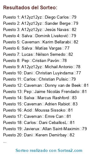 Lista de participantes: Dani Stephan El Shaarawy 82, Dani Aaron Wan-Bissaka 79, Carlos Abdou Diallo 79, Campero Abdoulaye Doucouré 81, Jaime Achraf HakimiL 79, A12yz12yz Adama Traoré 76, Caveman Adrien Rabiot 83, Campero Alban LafontL 79, Pep Alejandro Gómez 85, Javierux Aleksandar Kolarov 82, Alavarogf-9 Alessandro Florenzi 81, Dani Alessio Cragno 81, Caveman Alex Meret 78, Campero Alex Oxlade-Chamberlain 80, Alavarogf-9 Alex Teixeira 79, Campero Alex Telles 84, Tucho Alexandr Golovin 79, Javierux Alexandre Lacazette 86, Javierux Allan Saint-Maximin 79, Caveman Alphonse Areola 82, Carlos Ander Herrera 82, Salva André Gomes 80, Jaime André Onana 82, Carlos Andrea Belotti 82, Caveman Andrej Kramarić 83, Carlos Andrey Lunev 79, A12yz12yz Andriy Lunin 76, Pep Ángel Correa 82, Lucas Ángel Di María 86, Javierux Angeliño 79, Alavarogf-9 Ante Rebić 80, Carlos Anthony Martial 83, Salva Antonio Rüdiger 82, Carlos Arthur 84, Tucho Arthur Masuaku 76, A12yz12yz Arturo Vidal 84, Carlos Azpilicueta 84, Alavarogf-9 Badou Ndiaye 76, Jaime Benjamin Pavard 79, Pep Benjamin Verbič 79, Acid Bernd Leno 84, Campero Bruma 78, Acid Bruno Fernandes 85, A12yz12yz Capa 78, Pep Cédric Bakambu 82, Salva Chris Smalling 80, Dani Christian Luyindama 77, Carlos Christian Pulisic 79, Jaime Ciro Immobile 86, Caveman Clément Lenglet 85, Pep Cristian Pavón 78, Tucho Damián Suárez 79, Carlos Dani CeballosL 81, Tucho Daniele Rugani 82, Pep Danny da Costa 79, Dani David Abraham 78, Acid David Neres 81, Salva Davinson Sánchez 83, A12yz12yz Dayot Upamecano 77, Acid DeAndre Yedlin 76, Pep Denis Cheryshev 79, Carlos Denis Zakaria 78, Tucho Denzel Dumfries 78, A12yz12yz Deulofeu 80, A12yz12yz Diego Carlos 79, Tucho Divock Origi 78, Salva Dominik Livaković 79, Caveman Donny van de Beek 81, A12yz12yz Douglas Costa 84, Acid Éder Militão 81, Dani Edgar Manuel Guichón 78, Carlos Eduardo Salvio 80, Lucas Egidio Maestre Schetino 82, Javierux Eljero Elia 77, Carlos Elseid Hysaj 80, Caveman Emre Can 81, Pep Enzo Martín Riquero 79, Acid Eric Bailly 80, A12yz12yz Esteban Andrada 79, Lucas Éver Banega 83, Lucas Exequiel Palacios 77, Acid Ezequiel Lavezzi 79, Lucas Fabricio Bustos 77, Alavarogf-9 Ferland Mendy 80, Caveman Filip Kostić 82, Salva Franck Yannick Kessié 79, Alavarogf-9 Frank Acheampong 77, Alavarogf-9 Frank Fabra 77, Acid Fred 79, Carlos Frenkie de Jong 85, Caveman Gabriel Jesus 82, Pep Gabriel Paulista 82, Alavarogf-9 Gareth Bale 85, Carlos Gayà 80, Salva Gelson Martins 82, Javierux Geoffrey Kondogbia 81, Alavarogf-9 Georgiy Dzhikiya 78, Lucas Gerónimo Rulli 81, Lucas Giovani Lo Celso 83, Tucho Grimaldo 83, Campero Héctor Herrera 82, Campero Henrikh Mkhitaryan 81, Acid Henry Onyekuru 78, Acid Hirving Lozano 82, Dani Houssem Aouar 81, Jaime Ibrahima Konaté 79, Jaime Idrissa Gueye 83, Campero Iñaki Williams 82, Lucas Jadon Sancho 84, Pep Jaime Nicolás Frendado 81, Pep Jamie Vardy 82, Pep Jaume 76, Tucho Jean-Paul Boëtius 78, Acid Jean-Philippe Gbamin 79, Javierux Jérôme Boateng 84, Salva Jérôme Roussillon 82, Salva Jesse Lingard 82, A12yz12yz Jesús Navas 82, Javierux Jiří Pavlenka 84, Alavarogf-9 Joakim Mæhle 77, Campero João Cancelo 84, Dani João Félix 80, Lucas Joaquín Correa 80, Campero Joe Gomez 80, Caveman Joel Matip 82, Tucho Joel Robles 78, Jaime Jonathan Ikoné 78, Caveman Jordan Lukaku 77, Campero Jordan Pickford 83, Carlos Josef Martínez 81, Dani Joshua King 79, Acid Josué Chiamulera 83, Javierux Juan Cuadrado 83, Lucas Juan Musso 78, Javierux Juiano Mestres 82, Jaime Julian Brandt 84, Caveman Julian Draxler 83, Acid Junior Firpo 79, Alavarogf-9 Kai Havertz 84, Caveman Karim Bellarabi 82, Tucho Keita Baldé 80, Alavarogf-9 Kepa 84, Dani Kerem Demirbay 82, Carlos Kevin Mbabu 77, Tucho Kevin Vogt 80, A12yz12yz Kieran Tierney 76, Caveman Kingsley Coman 84, A12yz12yz Kostas Manolas 85, Dani Kyle Walker 84, Dani Lautaro Martínez 81, Lucas Leandro Paredes 80, Caveman Leon Bailey 82, Alavarogf-9 Leon Goretzka 84, Javierux Leonardo Pavoletti 78, Lucas Leonardo Sigali 79, Tucho Leroy Sané 86, Lucas Lisandro López 81, Lucas Lisandro Martínez 77, Jaime Lorenzo Pellegrini 79, Dani Loris KariusL 79, Alavarogf-9 Lucas Hernández 84, Salva Lucas Moura 83, Campero Luis Muriel 80, Alavarogf-9 Łukasz Fabiański 82, Alavarogf-9 Manuel Akanji 83, Tucho Manuel Lazzari 79, Javierux Marcano 79, Lucas Marcos Acuña 81, Salva Marcus Rashford 83, Javierux Mariano 79, Jaime Mario Hermoso 80, Pep Mário Rui 79, Campero Marouane Fellaini 76, Dani Martin ØdegaardL 78, A12yz12yz Mateo Kovačić 82, Salva Matías Vargas 77, Caveman Matías Zaracho 78, Salva Mattia Perin 82, Salva M'Baye Niang 77, Dani Memphis Depay 84, A12yz12yz Michail Antonio 78, Tucho Morales 81, Jaime Moussa Dembélé 79, Alavarogf-9 Moussa Marega 80, Acid Moussa Sissoko 81, Salva Nabil Fekir 84, Campero Naby Keïta 82, Dani Nacho Fernández 82, Jaime Nathan Aké 81, Lucas Nélson Semedo 82, Javierux Nick Pope 79, Jaime Nico Schulz 82, Lucas Nicolás Otamendi 83, Campero Nicolas Pépé 83, Lucas Nicolás Tagliafico 82, Tucho Ogenyi Onazi 76, Carlos Ousmane Dembélé 84, Jaime Oyarzabal 82, Pep Paulinho 84, Jaime Pierluigi Gollini 76, Tucho Piotr Zieliński 81, Carlos Presnel Kimpembe 82, Javierux Quincy Promes 82, Javierux Radja Nainggolan 83, Campero Raphaël Varane 85, Salva Raphinha 79, Caveman Renato Sanches 76, Salva Renzo Saravia 78, Caveman Ricardo Pereira 82, Salva Richarlison 79, Alavarogf-9 Riyad Mahrez 84, A12yz12yz Rodrigo 83, Pep Rodrygo 76, A12yz12yz Ronaldo Esler 78, Campero Rúben Dias 80, A12yz12yz Ryan Fraser 81, A12yz12yz Sander Berge 79, Acid Santiago Arias 79, Javierux Sebastian Giovinco 81, A12yz12yz Segundo Mandíquez 81, Campero Serge Gnabry 84, Dani Sergi Roberto 82, Pep Sergio Asenjo 82, Pep Sokratis 84, Dani Stanislav Lobotka 79, Jaime Steven Bergwijn 82, Javierux Taison 82, Jaime Tanguy Ndombele 81, Campero Theo Hernández 76, Caveman Thilo Kehrer 79, Pep Thomas Delaney 82, Alavarogf-9 Thomas Meunier 82