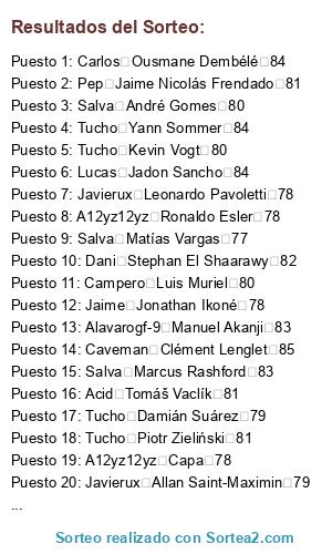 Lista de participantes: Dani Stephan El Shaarawy 82, Dani Aaron Wan-Bissaka 79, Carlos Abdou Diallo 79, Campero Abdoulaye Doucouré 81, Jaime Achraf HakimiL 79, A12yz12yz Adama Traoré 76, Caveman Adrien Rabiot 83, Campero Alban LafontL 79, Pep Alejandro Gómez 85, Javierux Aleksandar Kolarov 82, Alavarogf-9 Alessandro Florenzi 81, Dani Alessio Cragno 81, Caveman Alex Meret 78, Campero Alex Oxlade-Chamberlain 80, Alavarogf-9 Alex Teixeira 79, Campero Alex Telles 84, Tucho Alexandr Golovin 79, Javierux Alexandre Lacazette 86, Javierux Allan Saint-Maximin 79, Caveman Alphonse Areola 82, Carlos Ander Herrera 82, Salva André Gomes 80, Jaime André Onana 82, Carlos Andrea Belotti 82, Caveman Andrej Kramarić 83, Carlos Andrey Lunev 79, A12yz12yz Andriy Lunin 76, Pep Ángel Correa 82, Lucas Ángel Di María 86, Javierux Angeliño 79, Alavarogf-9 Ante Rebić 80, Carlos Anthony Martial 83, Salva Antonio Rüdiger 82, Carlos Arthur 84, Tucho Arthur Masuaku 76, A12yz12yz Arturo Vidal 84, Carlos Azpilicueta 84, Alavarogf-9 Badou Ndiaye 76, Jaime Benjamin Pavard 79, Pep Benjamin Verbič 79, Acid Bernd Leno 84, Campero Bruma 78, Acid Bruno Fernandes 85, A12yz12yz Capa 78, Pep Cédric Bakambu 82, Salva Chris Smalling 80, Dani Christian Luyindama 77, Carlos Christian Pulisic 79, Jaime Ciro Immobile 86, Caveman Clément Lenglet 85, Pep Cristian Pavón 78, Tucho Damián Suárez 79, Carlos Dani CeballosL 81, Tucho Daniele Rugani 82, Pep Danny da Costa 79, Dani David Abraham 78, Acid David Neres 81, Salva Davinson Sánchez 83, A12yz12yz Dayot Upamecano 77, Acid DeAndre Yedlin 76, Pep Denis Cheryshev 79, Carlos Denis Zakaria 78, Tucho Denzel Dumfries 78, A12yz12yz Deulofeu 80, A12yz12yz Diego Carlos 79, Tucho Divock Origi 78, Salva Dominik Livaković 79, Caveman Donny van de Beek 81, A12yz12yz Douglas Costa 84, Acid Éder Militão 81, Dani Edgar Manuel Guichón 78, Carlos Eduardo Salvio 80, Lucas Egidio Maestre Schetino 82, Javierux Eljero Elia 77, Carlos Elseid Hysaj 80, Caveman Emre Can 81, Pep Enzo Martín Riquero 79, Acid Eric Bailly 80, A12yz12yz Esteban Andrada 79, Lucas Éver Banega 83, Lucas Exequiel Palacios 77, Acid Ezequiel Lavezzi 79, Lucas Fabricio Bustos 77, Alavarogf-9 Ferland Mendy 80, Caveman Filip Kostić 82, Salva Franck Yannick Kessié 79, Alavarogf-9 Frank Acheampong 77, Alavarogf-9 Frank Fabra 77, Acid Fred 79, Carlos Frenkie de Jong 85, Caveman Gabriel Jesus 82, Pep Gabriel Paulista 82, Alavarogf-9 Gareth Bale 85, Carlos Gayà 80, Salva Gelson Martins 82, Javierux Geoffrey Kondogbia 81, Alavarogf-9 Georgiy Dzhikiya 78, Lucas Gerónimo Rulli 81, Lucas Giovani Lo Celso 83, Tucho Grimaldo 83, Campero Héctor Herrera 82, Campero Henrikh Mkhitaryan 81, Acid Henry Onyekuru 78, Acid Hirving Lozano 82, Dani Houssem Aouar 81, Jaime Ibrahima Konaté 79, Jaime Idrissa Gueye 83, Campero Iñaki Williams 82, Lucas Jadon Sancho 84, Pep Jaime Nicolás Frendado 81, Pep Jamie Vardy 82, Pep Jaume 76, Tucho Jean-Paul Boëtius 78, Acid Jean-Philippe Gbamin 79, Javierux Jérôme Boateng 84, Salva Jérôme Roussillon 82, Salva Jesse Lingard 82, A12yz12yz Jesús Navas 82, Javierux Jiří Pavlenka 84, Alavarogf-9 Joakim Mæhle 77, Campero João Cancelo 84, Dani João Félix 80, Lucas Joaquín Correa 80, Campero Joe Gomez 80, Caveman Joel Matip 82, Tucho Joel Robles 78, Jaime Jonathan Ikoné 78, Caveman Jordan Lukaku 77, Campero Jordan Pickford 83, Carlos Josef Martínez 81, Dani Joshua King 79, Acid Josué Chiamulera 83, Javierux Juan Cuadrado 83, Lucas Juan Musso 78, Javierux Juiano Mestres 82, Jaime Julian Brandt 84, Caveman Julian Draxler 83, Acid Junior Firpo 79, Alavarogf-9 Kai Havertz 84, Caveman Karim Bellarabi 82, Tucho Keita Baldé 80, Alavarogf-9 Kepa 84, Dani Kerem Demirbay 82, Carlos Kevin Mbabu 77, Tucho Kevin Vogt 80, A12yz12yz Kieran Tierney 76, Caveman Kingsley Coman 84, A12yz12yz Kostas Manolas 85, Dani Kyle Walker 84, Dani Lautaro Martínez 81, Lucas Leandro Paredes 80, Caveman Leon Bailey 82, Alavarogf-9 Leon Goretzka 84, Javierux Leonardo Pavoletti 78, Lucas Leonardo Sigali 79, Tucho Leroy Sané 86, Lucas Lisandro López 81, Lucas Lisandro Martínez 77, Jaime Lorenzo Pellegrini 79, Dani Loris KariusL 79, Alavarogf-9 Lucas Hernández 84, Salva Lucas Moura 83, Campero Luis Muriel 80, Alavarogf-9 Łukasz Fabiański 82, Alavarogf-9 Manuel Akanji 83, Tucho Manuel Lazzari 79, Javierux Marcano 79, Lucas Marcos Acuña 81, Salva Marcus Rashford 83, Javierux Mariano 79, Jaime Mario Hermoso 80, Pep Mário Rui 79, Campero Marouane Fellaini 76, Dani Martin ØdegaardL 78, A12yz12yz Mateo Kovačić 82, Salva Matías Vargas 77, Caveman Matías Zaracho 78, Salva Mattia Perin 82, Salva M'Baye Niang 77, Dani Memphis Depay 84, A12yz12yz Michail Antonio 78, Tucho Morales 81, Jaime Moussa Dembélé 79, Alavarogf-9 Moussa Marega 80, Acid Moussa Sissoko 81, Salva Nabil Fekir 84, Campero Naby Keïta 82, Dani Nacho Fernández 82, Jaime Nathan Aké 81, Lucas Nélson Semedo 82, Javierux Nick Pope 79, Jaime Nico Schulz 82, Lucas Nicolás Otamendi 83, Campero Nicolas Pépé 83, Lucas Nicolás Tagliafico 82, Tucho Ogenyi Onazi 76, Carlos Ousmane Dembélé 84, Jaime Oyarzabal 82, Pep Paulinho 84, Jaime Pierluigi Gollini 76, Tucho Piotr Zieliński 81, Carlos Presnel Kimpembe 82, Javierux Quincy Promes 82, Javierux Radja Nainggolan 83, Campero Raphaël Varane 85, Salva Raphinha 79, Caveman Renato Sanches 76, Salva Renzo Saravia 78, Caveman Ricardo Pereira 82, Salva Richarlison 79, Alavarogf-9 Riyad Mahrez 84, A12yz12yz Rodrigo 83, Pep Rodrygo 76, A12yz12yz Ronaldo Esler 78, Campero Rúben Dias 80, A12yz12yz Ryan Fraser 81, A12yz12yz Sander Berge 79, Acid Santiago Arias 79, Javierux Sebastian Giovinco 81, A12yz12yz Segundo Mandíquez 81, Campero Serge Gnabry 84, Dani Sergi Roberto 82, Pep Sergio Asenjo 82, Pep Sokratis 84, Dani Stanislav Lobotka 79, Jaime Steven Bergwijn 82, Javierux Taison 82, Jaime Tanguy Ndombele 81, Campero Theo Hernández 76, Caveman Thilo Kehrer 79, Pep Thomas Delaney 82, Alavarogf-9 Thomas Meunier 82