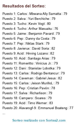 Lista de participantes: Dani Stephan El Shaarawy 82, Dani Aaron Wan-Bissaka 79, Carlos Abdou Diallo 79, Campero Abdoulaye Doucouré 81, Jaime Achraf HakimiL 79, A12yz12yz Adama Traoré 76, Caveman Adrien Rabiot 83, Campero Alban LafontL 79, Pep Alejandro Gómez 85, Javierux Aleksandar Kolarov 82, Alavarogf-9 Alessandro Florenzi 81, Dani Alessio Cragno 81, Caveman Alex Meret 78, Campero Alex Oxlade-Chamberlain 80, Alavarogf-9 Alex Teixeira 79, Campero Alex Telles 84, Tucho Alexandr Golovin 79, Javierux Alexandre Lacazette 86, Javierux Allan Saint-Maximin 79, Caveman Alphonse Areola 82, Carlos Ander Herrera 82, Salva André Gomes 80, Jaime André Onana 82, Carlos Andrea Belotti 82, Caveman Andrej Kramarić 83, Carlos Andrey Lunev 79, A12yz12yz Andriy Lunin 76, Pep Ángel Correa 82, Lucas Ángel Di María 86, Javierux Angeliño 79, Alavarogf-9 Ante Rebić 80, Carlos Anthony Martial 83, Salva Antonio Rüdiger 82, Carlos Arthur 84, Tucho Arthur Masuaku 76, A12yz12yz Arturo Vidal 84, Carlos Azpilicueta 84, Alavarogf-9 Badou Ndiaye 76, Jaime Benjamin Pavard 79, Pep Benjamin Verbič 79, Acid Bernd Leno 84, Campero Bruma 78, Acid Bruno Fernandes 85, A12yz12yz Capa 78, Pep Cédric Bakambu 82, Salva Chris Smalling 80, Dani Christian Luyindama 77, Carlos Christian Pulisic 79, Jaime Ciro Immobile 86, Caveman Clément Lenglet 85, Pep Cristian Pavón 78, Tucho Damián Suárez 79, Carlos Dani CeballosL 81, Tucho Daniele Rugani 82, Pep Danny da Costa 79, Dani David Abraham 78, Acid David Neres 81, Salva Davinson Sánchez 83, A12yz12yz Dayot Upamecano 77, Acid DeAndre Yedlin 76, Pep Denis Cheryshev 79, Carlos Denis Zakaria 78, Tucho Denzel Dumfries 78, A12yz12yz Deulofeu 80, A12yz12yz Diego Carlos 79, Tucho Divock Origi 78, Salva Dominik Livaković 79, Caveman Donny van de Beek 81, A12yz12yz Douglas Costa 84, Acid Éder Militão 81, Dani Edgar Manuel Guichón 78, Carlos Eduardo Salvio 80, Lucas Egidio Maestre Schetino 82, Javierux Eljero Elia 77, Carlos Elseid Hysaj 80, Caveman Emre Can 81, Pep Enzo Martín Riquero 79, Acid Eric Bailly 80, A12yz12yz Esteban Andrada 79, Lucas Éver Banega 83, Lucas Exequiel Palacios 77, Acid Ezequiel Lavezzi 79, Lucas Fabricio Bustos 77, Alavarogf-9 Ferland Mendy 80, Caveman Filip Kostić 82, Salva Franck Yannick Kessié 79, Alavarogf-9 Frank Acheampong 77, Alavarogf-9 Frank Fabra 77, Acid Fred 79, Carlos Frenkie de Jong 85, Caveman Gabriel Jesus 82, Pep Gabriel Paulista 82, Alavarogf-9 Gareth Bale 85, Carlos Gayà 80, Salva Gelson Martins 82, Javierux Geoffrey Kondogbia 81, Alavarogf-9 Georgiy Dzhikiya 78, Lucas Gerónimo Rulli 81, Lucas Giovani Lo Celso 83, Tucho Grimaldo 83, Campero Héctor Herrera 82, Campero Henrikh Mkhitaryan 81, Acid Henry Onyekuru 78, Acid Hirving Lozano 82, Dani Houssem Aouar 81, Jaime Ibrahima Konaté 79, Jaime Idrissa Gueye 83, Campero Iñaki Williams 82, Lucas Jadon Sancho 84, Pep Jaime Nicolás Frendado 81, Pep Jamie Vardy 82, Pep Jaume 76, Tucho Jean-Paul Boëtius 78, Acid Jean-Philippe Gbamin 79, Javierux Jérôme Boateng 84, Salva Jérôme Roussillon 82, Salva Jesse Lingard 82, A12yz12yz Jesús Navas 82, Javierux Jiří Pavlenka 84, Alavarogf-9 Joakim Mæhle 77, Campero João Cancelo 84, Dani João Félix 80, Lucas Joaquín Correa 80, Campero Joe Gomez 80, Caveman Joel Matip 82, Tucho Joel Robles 78, Jaime Jonathan Ikoné 78, Caveman Jordan Lukaku 77, Campero Jordan Pickford 83, Carlos Josef Martínez 81, Dani Joshua King 79, Acid Josué Chiamulera 83, Javierux Juan Cuadrado 83, Lucas Juan Musso 78, Javierux Juiano Mestres 82, Jaime Julian Brandt 84, Caveman Julian Draxler 83, Acid Junior Firpo 79, Alavarogf-9 Kai Havertz 84, Caveman Karim Bellarabi 82, Tucho Keita Baldé 80, Alavarogf-9 Kepa 84, Dani Kerem Demirbay 82, Carlos Kevin Mbabu 77, Tucho Kevin Vogt 80, A12yz12yz Kieran Tierney 76, Caveman Kingsley Coman 84, A12yz12yz Kostas Manolas 85, Dani Kyle Walker 84, Dani Lautaro Martínez 81, Lucas Leandro Paredes 80, Caveman Leon Bailey 82, Alavarogf-9 Leon Goretzka 84, Javierux Leonardo Pavoletti 78, Lucas Leonardo Sigali 79, Tucho Leroy Sané 86, Lucas Lisandro López 81, Lucas Lisandro Martínez 77, Jaime Lorenzo Pellegrini 79, Dani Loris KariusL 79, Alavarogf-9 Lucas Hernández 84, Salva Lucas Moura 83, Campero Luis Muriel 80, Alavarogf-9 Łukasz Fabiański 82, Alavarogf-9 Manuel Akanji 83, Tucho Manuel Lazzari 79, Javierux Marcano 79, Lucas Marcos Acuña 81, Salva Marcus Rashford 83, Javierux Mariano 79, Jaime Mario Hermoso 80, Pep Mário Rui 79, Campero Marouane Fellaini 76, Dani Martin ØdegaardL 78, A12yz12yz Mateo Kovačić 82, Salva Matías Vargas 77, Caveman Matías Zaracho 78, Salva Mattia Perin 82, Salva M'Baye Niang 77, Dani Memphis Depay 84, A12yz12yz Michail Antonio 78, Tucho Morales 81, Jaime Moussa Dembélé 79, Alavarogf-9 Moussa Marega 80, Acid Moussa Sissoko 81, Salva Nabil Fekir 84, Campero Naby Keïta 82, Dani Nacho Fernández 82, Jaime Nathan Aké 81, Lucas Nélson Semedo 82, Javierux Nick Pope 79, Jaime Nico Schulz 82, Lucas Nicolás Otamendi 83, Campero Nicolas Pépé 83, Lucas Nicolás Tagliafico 82, Tucho Ogenyi Onazi 76, Carlos Ousmane Dembélé 84, Jaime Oyarzabal 82, Pep Paulinho 84, Jaime Pierluigi Gollini 76, Tucho Piotr Zieliński 81, Carlos Presnel Kimpembe 82, Javierux Quincy Promes 82, Javierux Radja Nainggolan 83, Campero Raphaël Varane 85, Salva Raphinha 79, Caveman Renato Sanches 76, Salva Renzo Saravia 78, Caveman Ricardo Pereira 82, Salva Richarlison 79, Alavarogf-9 Riyad Mahrez 84, A12yz12yz Rodrigo 83, Pep Rodrygo 76, A12yz12yz Ronaldo Esler 78, Campero Rúben Dias 80, A12yz12yz Ryan Fraser 81, A12yz12yz Sander Berge 79, Acid Santiago Arias 79, Javierux Sebastian Giovinco 81, A12yz12yz Segundo Mandíquez 81, Campero Serge Gnabry 84, Dani Sergi Roberto 82, Pep Sergio Asenjo 82, Pep Sokratis 84, Dani Stanislav Lobotka 79, Jaime Steven Bergwijn 82, Javierux Taison 82, Jaime Tanguy Ndombele 81, Campero Theo Hernández 76, Caveman Thilo Kehrer 79, Pep Thomas Delaney 82, Alavarogf-9 Thomas Meunier 82