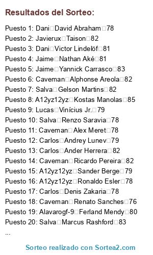 Lista de participantes: Dani Aaron Wan-Bissaka 79, Carlos Abdou Diallo 79, Campero Abdoulaye Doucouré 81, Jaime Achraf HakimiL 79, A12yz12yz Adama Traoré 76, Caveman Adrien Rabiot 83, Jaime Agustín Marchesín 78, Campero Alban LafontL 79, Dani Alejandro Gómez 85, Javierux Aleksandar Kolarov 82, Alavarogf-9 Alessandro Florenzi 81, Dani Alessio Cragno 81, Caveman Alex Meret 78, Campero Alex Oxlade-Chamberlain 80, Alavarogf-9 Alex Teixeira 79, Campero Alex Telles 84, Tucho Alexandr Golovin 79, Javierux Alexandre Lacazette 86, Pep Allan 85, Javierux Allan Saint-Maximin 79, Caveman Alphonse Areola 82, Carlos Ander Herrera 82, Salva André Gomes 80, Jaime André Onana 82, Carlos Andrea Belotti 82, Javierux Andrea Consigli 81, Caveman Andrej Kramarić 83, Carlos Andrey Lunev 79, A12yz12yz Andriy Lunin 76, Pep Ángel Correa 82, Lucas Ángel Di María 86, Javierux Angeliño 79, Alavarogf-9 Ante Rebić 80, Carlos Anthony Martial 83, Salva Antonio Rüdiger 82, Carlos Arthur 84, Tucho Arthur Masuaku 76, A12yz12yz Arturo Vidal 84, Carlos Azpilicueta 84, Alavarogf-9 Badou Ndiaye 76, Jaime Benjamin Pavard 79, Pep Benjamin Verbič 79, Javierux Bernat 80, Acid Bernd Leno 84, Campero Bruma 78, Acid Bruno Fernandes 85, A12yz12yz Capa 78, Pep Cédric Bakambu 82, Salva Chris Smalling 80, Dani Christian Luyindama 77, Carlos Christian Pulisic 79, Jaime Ciro Immobile 86, Caveman Clément Lenglet 85, Pep Cristian Pavón 78, Tucho Damián Suárez 79, Carlos Dani CeballosL 81, Tucho Daniele Rugani 82, Pep Danny da Costa 79, Dani David Abraham 78, Acid David Neres 81, Salva Davinson Sánchez 83, A12yz12yz Dayot Upamecano 77, Acid DeAndre Yedlin 76, Pep Denis Cheryshev 79, Carlos Denis Zakaria 78, Tucho Denzel Dumfries 78, A12yz12yz Deulofeu 80, A12yz12yz Diego Carlos 79, Tucho Divock Origi 78, Salva Dominik Livaković 79, Caveman Donny van de Beek 81, A12yz12yz Douglas Costa 84, Acid Éder Militão 81, Dani Edgar Manuel Guichón 78, Carlos Eduardo Salvio 80, Lucas Egidio Maestre Schetino 82, Carlos Elseid Hysaj 80, Caveman Emre Can 81, Pep Enzo Martín Riquero 79, Acid Eric Bailly 80, A12yz12yz Esteban Andrada 79, Lucas Éver Banega 83, Lucas Exequiel Palacios 77, Acid Ezequiel Lavezzi 79, Lucas Fabricio Bustos 77, Javierux Federico Valverde 77, Alavarogf-9 Ferland Mendy 80, Caveman Filip Kostić 82, Javierux Francis Coquelin 80, Salva Franck Yannick Kessié 79, Alavarogf-9 Frank Acheampong 77, Alavarogf-9 Frank Fabra 77, Acid Fred 79, Carlos Frenkie de Jong 85, Caveman Gabriel Jesus 82, Pep Gabriel Paulista 82, Alavarogf-9 Gareth Bale 85, Carlos Gayà 80, Salva Gelson Martins 82, Javierux Geoffrey Kondogbia 81, Alavarogf-9 Georgiy Dzhikiya 78, Lucas Gerónimo Rulli 81, Lucas Giovani Lo Celso 83, Tucho Grimaldo 83, Campero Héctor Herrera 82, Campero Henrikh Mkhitaryan 81, Acid Henry Onyekuru 78, Acid Hirving Lozano 82, Dani Houssem Aouar 81, Jaime Ibrahima Konaté 79, Jaime Idrissa Gueye 83, Campero Iñaki Williams 82, Lucas Jadon Sancho 84, Pep Jaime Nicolás Frendado 81, Pep Jamie Vardy 82, Pep Jaume 76, Tucho Jean-Paul Boëtius 78, Acid Jean-Philippe Gbamin 79, Javierux Jérôme Boateng 84, Salva Jérôme Roussillon 82, Salva Jesse Lingard 82, A12yz12yz Jesús Navas 82, Javierux Jiří Pavlenka 84, Alavarogf-9 Joakim Mæhle 77, Campero João Cancelo 84, Dani João Félix 80, Lucas Joaquín Correa 80, Campero Joe Gomez 80, Caveman Joel Matip 82, Tucho Joel Robles 78, Jaime Jonathan Ikoné 78, Caveman Jordan Lukaku 77, Campero Jordan Pickford 83, Carlos Josef Martínez 81, Acid Josué Chiamulera 83, Javierux Juan Cuadrado 83, Lucas Juan Musso 78, Jaime Julian Brandt 84, Caveman Julian Draxler 83, Acid Junior Firpo 79, Alavarogf-9 Kai Havertz 84, Caveman Karim Bellarabi 82, Tucho Keita Baldé 80, Alavarogf-9 Kepa 84, Dani Kerem Demirbay 82, Carlos Kevin Mbabu 77, Tucho Kevin Vogt 80, A12yz12yz Kieran Tierney 76, Caveman Kingsley Coman 84, A12yz12yz Kostas Manolas 85, Dani Kyle Walker 84, Dani Lautaro Martínez 81, Lucas Leandro Paredes 80, Caveman Leon Bailey 82, Alavarogf-9 Leon Goretzka 84, Javierux Leonardo Pavoletti 78, Lucas Leonardo Sigali 79, Tucho Leroy Sané 86, Lucas Lisandro López 81, Lucas Lisandro Martínez 77, Jaime Lorenzo Pellegrini 79, Dani Loris KariusL 79, Alavarogf-9 Lucas Hernández 84, Salva Lucas Moura 83, Campero Luis Muriel 80, Alavarogf-9 Łukasz Fabiański 82, Alavarogf-9 Manuel Akanji 83, Tucho Manuel Lazzari 79, Javierux Marcano 79, Lucas Marcos Acuña 81, Salva Marcus Rashford 83, Jaime Mario Hermoso 80, Pep Mário Rui 79, Campero Marouane Fellaini 76, Dani Martin ØdegaardL 78, A12yz12yz Mateo Kovačić 82, Salva Matías Vargas 77, Caveman Matías Zaracho 78, Salva Mattia Perin 82, Salva M'Baye Niang 77, Dani Memphis Depay 84, A12yz12yz Michail Antonio 78, Javierux Milot Rashica 79, Tucho Morales 81, Jaime Moussa Dembélé 79, Alavarogf-9 Moussa Marega 80, Acid Moussa Sissoko 81, Salva Nabil Fekir 84, Campero Naby Keïta 82, Dani Nacho Fernández 82, Jaime Nathan Aké 81, Lucas Nélson Semedo 82, Jaime Nico Schulz 82, Lucas Nicolás Otamendi 83, Campero Nicolas Pépé 83, Lucas Nicolás Tagliafico 82, Tucho Ogenyi Onazi 76, Carlos Ousmane Dembélé 84, Jaime Oyarzabal 82, Pep Paulinho 84, Tucho Piotr Zieliński 81, Carlos Presnel Kimpembe 82, Javierux Quincy Promes 82, Javierux Radja Nainggolan 83, Campero Raphaël Varane 85, Salva Raphinha 79, Caveman Renato Sanches 76, Salva Renzo Saravia 78, Caveman Ricardo Pereira 82, Salva Richarlison 79, Alavarogf-9 Riyad Mahrez 84, A12yz12yz Rodrigo 83, Pep Rodrygo 76, A12yz12yz Ronaldo Esler 78, Campero Rúben Dias 80, A12yz12yz Ryan Fraser 81, A12yz12yz Sander Berge 79, Acid Santiago Arias 79, Javierux Sebastian Giovinco 81, A12yz12yz Segundo Mandíquez 81, Campero Serge Gnabry 84, Dani Sergi Roberto 82, Pep Sergio Asenjo 82, Pep Sokratis 84, Dani Stanislav Lobotka 79, Dani Stephan El Shaarawy 82, Jaime Steven Bergwijn 82, Javierux Taison 82, Jaime Tanguy Ndombele 81, Campero Theo Hernández 76, Caveman Thilo Kehrer 79, Pep Thomas Delan