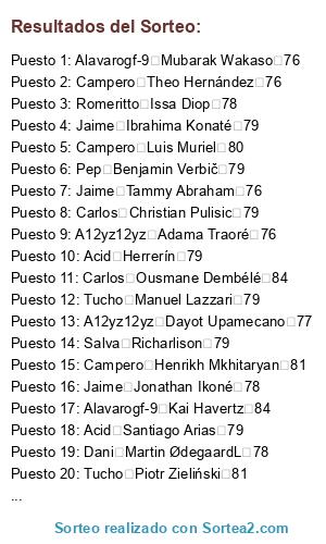 Lista de participantes: Dani Aaron Wan-Bissaka 79, Carlos Abdou Diallo 79, Campero Abdoulaye Doucouré 81, Jaime Achraf HakimiL 79, A12yz12yz Adama Traoré 76, Caveman Adrien Rabiot 83, Jaime Agustín Marchesín 78, Campero Alban LafontL 79, Dani Alejandro Gómez 85, Javierux Aleksandar Kolarov 82, Alavarogf-9 Alessandro Florenzi 81, Dani Alessio Cragno 81, Caveman Alex Meret 78, Campero Alex Oxlade-Chamberlain 80, Alavarogf-9 Alex Teixeira 79, Campero Alex Telles 84, Tucho Alexandr Golovin 79, Javierux Alexandre Lacazette 86, Pep Allan 85, Javierux Allan Saint-Maximin 79, Caveman Alphonse Areola 82, Carlos Ander Herrera 82, Salva André Gomes 80, Jaime André Onana 82, Carlos Andrea Belotti 82, Javierux Andrea Consigli 81, Caveman Andrej Kramarić 83, Carlos Andrey Lunev 79, A12yz12yz Andriy Lunin 76, Pep Ángel Correa 82, Lucas Ángel Di María 86, Javierux Angeliño 79, Alavarogf-9 Ante Rebić 80, Carlos Anthony Martial 83, Salva Antonio Rüdiger 82, Carlos Arthur 84, Tucho Arthur Masuaku 76, A12yz12yz Arturo Vidal 84, Carlos Azpilicueta 84, Alavarogf-9 Badou Ndiaye 76, Jaime Benjamin Pavard 79, Pep Benjamin Verbič 79, Javierux Bernat 80, Acid Bernd Leno 84, Campero Bruma 78, Acid Bruno Fernandes 85, A12yz12yz Capa 78, Pep Cédric Bakambu 82, Salva Chris Smalling 80, Dani Christian Luyindama 77, Carlos Christian Pulisic 79, Jaime Ciro Immobile 86, Caveman Clément Lenglet 85, Pep Cristian Pavón 78, Tucho Damián Suárez 79, Carlos Dani CeballosL 81, Tucho Daniele Rugani 82, Pep Danny da Costa 79, Dani David Abraham 78, Acid David Neres 81, Salva Davinson Sánchez 83, A12yz12yz Dayot Upamecano 77, Acid DeAndre Yedlin 76, Pep Denis Cheryshev 79, Carlos Denis Zakaria 78, Tucho Denzel Dumfries 78, A12yz12yz Deulofeu 80, A12yz12yz Diego Carlos 79, Tucho Divock Origi 78, Salva Dominik Livaković 79, Caveman Donny van de Beek 81, A12yz12yz Douglas Costa 84, Acid Éder Militão 81, Dani Edgar Manuel Guichón 78, Carlos Eduardo Salvio 80, Lucas Egidio Maestre Schetino 82, Carlos Elseid Hysaj 80, Caveman Emre Can 81, Pep Enzo Martín Riquero 79, Acid Eric Bailly 80, A12yz12yz Esteban Andrada 79, Lucas Éver Banega 83, Lucas Exequiel Palacios 77, Acid Ezequiel Lavezzi 79, Lucas Fabricio Bustos 77, Javierux Federico Valverde 77, Alavarogf-9 Ferland Mendy 80, Caveman Filip Kostić 82, Javierux Francis Coquelin 80, Salva Franck Yannick Kessié 79, Alavarogf-9 Frank Acheampong 77, Alavarogf-9 Frank Fabra 77, Acid Fred 79, Carlos Frenkie de Jong 85, Caveman Gabriel Jesus 82, Pep Gabriel Paulista 82, Alavarogf-9 Gareth Bale 85, Carlos Gayà 80, Salva Gelson Martins 82, Javierux Geoffrey Kondogbia 81, Alavarogf-9 Georgiy Dzhikiya 78, Lucas Gerónimo Rulli 81, Lucas Giovani Lo Celso 83, Tucho Grimaldo 83, Campero Héctor Herrera 82, Campero Henrikh Mkhitaryan 81, Acid Henry Onyekuru 78, Acid Hirving Lozano 82, Dani Houssem Aouar 81, Jaime Ibrahima Konaté 79, Jaime Idrissa Gueye 83, Campero Iñaki Williams 82, Lucas Jadon Sancho 84, Pep Jaime Nicolás Frendado 81, Pep Jamie Vardy 82, Pep Jaume 76, Tucho Jean-Paul Boëtius 78, Acid Jean-Philippe Gbamin 79, Javierux Jérôme Boateng 84, Salva Jérôme Roussillon 82, Salva Jesse Lingard 82, A12yz12yz Jesús Navas 82, Javierux Jiří Pavlenka 84, Alavarogf-9 Joakim Mæhle 77, Campero João Cancelo 84, Dani João Félix 80, Lucas Joaquín Correa 80, Campero Joe Gomez 80, Caveman Joel Matip 82, Tucho Joel Robles 78, Jaime Jonathan Ikoné 78, Caveman Jordan Lukaku 77, Campero Jordan Pickford 83, Carlos Josef Martínez 81, Acid Josué Chiamulera 83, Javierux Juan Cuadrado 83, Lucas Juan Musso 78, Jaime Julian Brandt 84, Caveman Julian Draxler 83, Acid Junior Firpo 79, Alavarogf-9 Kai Havertz 84, Caveman Karim Bellarabi 82, Tucho Keita Baldé 80, Alavarogf-9 Kepa 84, Dani Kerem Demirbay 82, Carlos Kevin Mbabu 77, Tucho Kevin Vogt 80, A12yz12yz Kieran Tierney 76, Caveman Kingsley Coman 84, A12yz12yz Kostas Manolas 85, Dani Kyle Walker 84, Dani Lautaro Martínez 81, Lucas Leandro Paredes 80, Caveman Leon Bailey 82, Alavarogf-9 Leon Goretzka 84, Javierux Leonardo Pavoletti 78, Lucas Leonardo Sigali 79, Tucho Leroy Sané 86, Lucas Lisandro López 81, Lucas Lisandro Martínez 77, Jaime Lorenzo Pellegrini 79, Dani Loris KariusL 79, Alavarogf-9 Lucas Hernández 84, Salva Lucas Moura 83, Campero Luis Muriel 80, Alavarogf-9 Łukasz Fabiański 82, Alavarogf-9 Manuel Akanji 83, Tucho Manuel Lazzari 79, Javierux Marcano 79, Lucas Marcos Acuña 81, Salva Marcus Rashford 83, Jaime Mario Hermoso 80, Pep Mário Rui 79, Campero Marouane Fellaini 76, Dani Martin ØdegaardL 78, A12yz12yz Mateo Kovačić 82, Salva Matías Vargas 77, Caveman Matías Zaracho 78, Salva Mattia Perin 82, Salva M'Baye Niang 77, Dani Memphis Depay 84, A12yz12yz Michail Antonio 78, Javierux Milot Rashica 79, Tucho Morales 81, Jaime Moussa Dembélé 79, Alavarogf-9 Moussa Marega 80, Acid Moussa Sissoko 81, Salva Nabil Fekir 84, Campero Naby Keïta 82, Dani Nacho Fernández 82, Jaime Nathan Aké 81, Lucas Nélson Semedo 82, Jaime Nico Schulz 82, Lucas Nicolás Otamendi 83, Campero Nicolas Pépé 83, Lucas Nicolás Tagliafico 82, Tucho Ogenyi Onazi 76, Carlos Ousmane Dembélé 84, Jaime Oyarzabal 82, Pep Paulinho 84, Tucho Piotr Zieliński 81, Carlos Presnel Kimpembe 82, Javierux Quincy Promes 82, Javierux Radja Nainggolan 83, Campero Raphaël Varane 85, Salva Raphinha 79, Caveman Renato Sanches 76, Salva Renzo Saravia 78, Caveman Ricardo Pereira 82, Salva Richarlison 79, Alavarogf-9 Riyad Mahrez 84, A12yz12yz Rodrigo 83, Pep Rodrygo 76, A12yz12yz Ronaldo Esler 78, Campero Rúben Dias 80, A12yz12yz Ryan Fraser 81, A12yz12yz Sander Berge 79, Acid Santiago Arias 79, Javierux Sebastian Giovinco 81, A12yz12yz Segundo Mandíquez 81, Campero Serge Gnabry 84, Dani Sergi Roberto 82, Pep Sergio Asenjo 82, Pep Sokratis 84, Dani Stanislav Lobotka 79, Dani Stephan El Shaarawy 82, Jaime Steven Bergwijn 82, Javierux Taison 82, Jaime Tanguy Ndombele 81, Campero Theo Hernández 76, Caveman Thilo Kehrer 79, Pep Thomas Delan