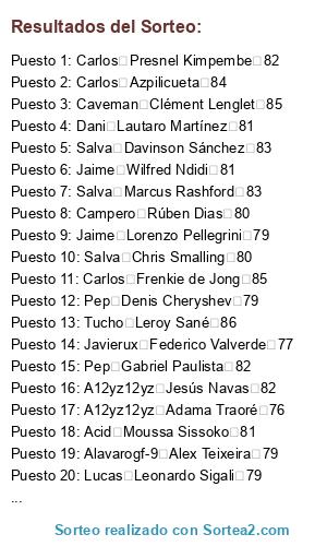 Lista de participantes: Dani Aaron Wan-Bissaka 79, Carlos Abdou Diallo 79, Campero Abdoulaye Doucouré 81, Jaime Achraf HakimiL 79, A12yz12yz Adama Traoré 76, Caveman Adrien Rabiot 83, Jaime Agustín Marchesín 78, Campero Alban LafontL 79, Dani Alejandro Gómez 85, Javierux Aleksandar Kolarov 82, Alavarogf-9 Alessandro Florenzi 81, Dani Alessio Cragno 81, Caveman Alex Meret 78, Campero Alex Oxlade-Chamberlain 80, Alavarogf-9 Alex Teixeira 79, Campero Alex Telles 84, Tucho Alexandr Golovin 79, Javierux Alexandre Lacazette 86, Pep Allan 85, Javierux Allan Saint-Maximin 79, Caveman Alphonse Areola 82, Carlos Ander Herrera 82, Salva André Gomes 80, Jaime André Onana 82, Carlos Andrea Belotti 82, Javierux Andrea Consigli 81, Caveman Andrej Kramarić 83, Carlos Andrey Lunev 79, A12yz12yz Andriy Lunin 76, Pep Ángel Correa 82, Lucas Ángel Di María 86, Javierux Angeliño 79, Alavarogf-9 Ante Rebić 80, Carlos Anthony Martial 83, Salva Antonio Rüdiger 82, Carlos Arthur 84, Tucho Arthur Masuaku 76, A12yz12yz Arturo Vidal 84, Carlos Azpilicueta 84, Alavarogf-9 Badou Ndiaye 76, Jaime Benjamin Pavard 79, Pep Benjamin Verbič 79, Javierux Bernat 80, Acid Bernd Leno 84, Campero Bruma 78, Acid Bruno Fernandes 85, A12yz12yz Capa 78, Pep Cédric Bakambu 82, Salva Chris Smalling 80, Dani Christian Luyindama 77, Carlos Christian Pulisic 79, Jaime Ciro Immobile 86, Caveman Clément Lenglet 85, Pep Cristian Pavón 78, Tucho Damián Suárez 79, Carlos Dani CeballosL 81, Tucho Daniele Rugani 82, Pep Danny da Costa 79, Dani David Abraham 78, Acid David Neres 81, Salva Davinson Sánchez 83, A12yz12yz Dayot Upamecano 77, Acid DeAndre Yedlin 76, Pep Denis Cheryshev 79, Carlos Denis Zakaria 78, Tucho Denzel Dumfries 78, A12yz12yz Deulofeu 80, A12yz12yz Diego Carlos 79, Tucho Divock Origi 78, Salva Dominik Livaković 79, Caveman Donny van de Beek 81, A12yz12yz Douglas Costa 84, Acid Éder Militão 81, Dani Edgar Manuel Guichón 78, Carlos Eduardo Salvio 80, Lucas Egidio Maestre Schetino 82, Carlos Elseid Hysaj 80, Caveman Emre Can 81, Pep Enzo Martín Riquero 79, Acid Eric Bailly 80, A12yz12yz Esteban Andrada 79, Lucas Éver Banega 83, Lucas Exequiel Palacios 77, Acid Ezequiel Lavezzi 79, Lucas Fabricio Bustos 77, Javierux Federico Valverde 77, Alavarogf-9 Ferland Mendy 80, Caveman Filip Kostić 82, Javierux Francis Coquelin 80, Salva Franck Yannick Kessié 79, Alavarogf-9 Frank Acheampong 77, Alavarogf-9 Frank Fabra 77, Acid Fred 79, Carlos Frenkie de Jong 85, Caveman Gabriel Jesus 82, Pep Gabriel Paulista 82, Alavarogf-9 Gareth Bale 85, Carlos Gayà 80, Salva Gelson Martins 82, Javierux Geoffrey Kondogbia 81, Alavarogf-9 Georgiy Dzhikiya 78, Lucas Gerónimo Rulli 81, Lucas Giovani Lo Celso 83, Tucho Grimaldo 83, Campero Héctor Herrera 82, Campero Henrikh Mkhitaryan 81, Acid Henry Onyekuru 78, Acid Hirving Lozano 82, Dani Houssem Aouar 81, Jaime Ibrahima Konaté 79, Jaime Idrissa Gueye 83, Campero Iñaki Williams 82, Lucas Jadon Sancho 84, Pep Jaime Nicolás Frendado 81, Pep Jamie Vardy 82, Pep Jaume 76, Tucho Jean-Paul Boëtius 78, Acid Jean-Philippe Gbamin 79, Javierux Jérôme Boateng 84, Salva Jérôme Roussillon 82, Salva Jesse Lingard 82, A12yz12yz Jesús Navas 82, Javierux Jiří Pavlenka 84, Alavarogf-9 Joakim Mæhle 77, Campero João Cancelo 84, Dani João Félix 80, Lucas Joaquín Correa 80, Campero Joe Gomez 80, Caveman Joel Matip 82, Tucho Joel Robles 78, Jaime Jonathan Ikoné 78, Caveman Jordan Lukaku 77, Campero Jordan Pickford 83, Carlos Josef Martínez 81, Acid Josué Chiamulera 83, Javierux Juan Cuadrado 83, Lucas Juan Musso 78, Jaime Julian Brandt 84, Caveman Julian Draxler 83, Acid Junior Firpo 79, Alavarogf-9 Kai Havertz 84, Caveman Karim Bellarabi 82, Tucho Keita Baldé 80, Alavarogf-9 Kepa 84, Dani Kerem Demirbay 82, Carlos Kevin Mbabu 77, Tucho Kevin Vogt 80, A12yz12yz Kieran Tierney 76, Caveman Kingsley Coman 84, A12yz12yz Kostas Manolas 85, Dani Kyle Walker 84, Dani Lautaro Martínez 81, Lucas Leandro Paredes 80, Caveman Leon Bailey 82, Alavarogf-9 Leon Goretzka 84, Javierux Leonardo Pavoletti 78, Lucas Leonardo Sigali 79, Tucho Leroy Sané 86, Lucas Lisandro López 81, Lucas Lisandro Martínez 77, Jaime Lorenzo Pellegrini 79, Dani Loris KariusL 79, Alavarogf-9 Lucas Hernández 84, Salva Lucas Moura 83, Campero Luis Muriel 80, Alavarogf-9 Łukasz Fabiański 82, Alavarogf-9 Manuel Akanji 83, Tucho Manuel Lazzari 79, Javierux Marcano 79, Lucas Marcos Acuña 81, Salva Marcus Rashford 83, Jaime Mario Hermoso 80, Pep Mário Rui 79, Campero Marouane Fellaini 76, Dani Martin ØdegaardL 78, A12yz12yz Mateo Kovačić 82, Salva Matías Vargas 77, Caveman Matías Zaracho 78, Salva Mattia Perin 82, Salva M'Baye Niang 77, Dani Memphis Depay 84, A12yz12yz Michail Antonio 78, Javierux Milot Rashica 79, Tucho Morales 81, Jaime Moussa Dembélé 79, Alavarogf-9 Moussa Marega 80, Acid Moussa Sissoko 81, Salva Nabil Fekir 84, Campero Naby Keïta 82, Dani Nacho Fernández 82, Jaime Nathan Aké 81, Lucas Nélson Semedo 82, Jaime Nico Schulz 82, Lucas Nicolás Otamendi 83, Campero Nicolas Pépé 83, Lucas Nicolás Tagliafico 82, Tucho Ogenyi Onazi 76, Carlos Ousmane Dembélé 84, Jaime Oyarzabal 82, Pep Paulinho 84, Tucho Piotr Zieliński 81, Carlos Presnel Kimpembe 82, Javierux Quincy Promes 82, Javierux Radja Nainggolan 83, Campero Raphaël Varane 85, Salva Raphinha 79, Caveman Renato Sanches 76, Salva Renzo Saravia 78, Caveman Ricardo Pereira 82, Salva Richarlison 79, Alavarogf-9 Riyad Mahrez 84, A12yz12yz Rodrigo 83, Pep Rodrygo 76, A12yz12yz Ronaldo Esler 78, Campero Rúben Dias 80, A12yz12yz Ryan Fraser 81, A12yz12yz Sander Berge 79, Acid Santiago Arias 79, Javierux Sebastian Giovinco 81, A12yz12yz Segundo Mandíquez 81, Campero Serge Gnabry 84, Dani Sergi Roberto 82, Pep Sergio Asenjo 82, Pep Sokratis 84, Dani Stanislav Lobotka 79, Dani Stephan El Shaarawy 82, Jaime Steven Bergwijn 82, Javierux Taison 82, Jaime Tanguy Ndombele 81, Campero Theo Hernández 76, Caveman Thilo Kehrer 79, Pep Thomas Delan