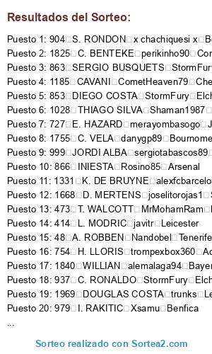 Lista de participantes: 20 ROBERTO FIRMINO o0 Sergi 0o Everton, 33 A. SCHURRLE perikinho90 Cordoba, 41 M. NEUER KaOs I AsTuR Oviedo, 43 J. BOATENG merayombasogo Juventus, 45 P. LAHM tabascos89 Barcelona, 48 A. ROBBEN Nandobel Tenerife, 49 T. MULLER Maybecohen Zaragoza, 50 F. RIBERY Ergion46 Monaco, 57 D. ALABA Havel7 Manchester City, 62 M. HUMMELS Sr bokeron Pescara, 66 M. GOTZE Andrew Torres UNAM Pumas, 74 R. LEWANDOWSKI Havel7 Manchester City, 79 M. REUS misterserpico West Ham, 81 R. PEREYRA danygp89 Bournomenth, 90 K. BELLARABI Sergio0004 Cska Moscu, 155 SOKRATIS Ronald Ol. Lyon, 156 NALDO merayombasogo Juventus, 244 P. CECH FonFenoso Ath. Bilbao, 252 D. STURRIDGE MrMohamRam Liverpool, 254 MATA Prince Sp. Lisboa, 256 DAVID LUIZ misterserpico West Ham, 264 R. LUKAKU Die1234 Cristal Palace, 279 P. POGBA Balles Rayo Vallecano, 305 L. SUAREZ Xsamu Benfica, 316 V. KOMPANY victub Valencia, 319 Y. TOURE alead71 Tottenham, 321 DAVID SILVA Prince Sp. Lisboa, 323 S. AGÜERO benniscuba Roma, 324 C. TEVEZ Prince Wolsfburgo, 334 Y. KONOPLYANKA Nandobel Tenerife, 337 DE GEA merayombasogo Juventus, 346 W. ROONEY Ergion46 Monaco, 347 J. HERNANDEZ sergiotabascos89 Manchester United, 378 A. TAARABT trompexbox360 Ac Milan, 414 L. MODRIC javitr Leicester, 415 G. BALE adrylito Malaga, 433 C. BEAUVUE Ramses17 Wolsfburgo, 471 A. RAMSEY alemalaga94 Bayern Munich, 473 T. WALCOTT MrMohamRam Liverpool, 474 R. VAN PERSIE borjituss Depor, 477 L. KOSCIELNY MrMohamRam Liverpool, 478 J. WILSHERE alemalaga94 Bayern Munich, 496 A. MARTIAL TheForceMaker Cadiz, 584 OSCAR sergiotabascos89 Manchester United, 604 NEYMAR Danibke New York City, 609 LUCAS Havel7 Manchester City, 635 S. DOUMBIA Saavexbox Las Palmas, 727 E. HAZARD merayombasogo Juventus, 741 L. REMY Adriantr127 Atco. Madrid, 754 H. LLORIS trompexbox360 Ac Milan, 775 J. PASTORE o0 Sergi 0o Everton, 778 S. SIRIGU ADONERI4 Napoles, 832 MUNIAIN toni1708 Celta, 844 FALCAO ADONERI4 Napoles, 845 A. TURAN Die1234 Cristal Palace, 846 D. GODIN tabascos89 Barcelona, 853 DIEGO COSTA StormFury Elche, 861 PIQUE SpiffiestJose Southampton, 863 SERGIO BUSQUETS StormFury Elche, 865 CESC FABREGAS Ozora10Tsubasa Boca Juniors, 866 INIESTA Rosino85 Arsenal, 867 L. MESSI FonFenoso Ath. Bilbao, 871 A. SANCHEZ joselitorojas1 Sassuolo, 872 THIAGO MrMohamRam Liverpool, 873 PEDRO Albervil A. Petrolera, 900 SANTI CAZORLA AndrewTorres UNAM Pumas, 904 S. RONDON x chachiquesi x Betis, 906 ISCO sergiotabascos89 Manchester United, 930 SERGIO RAMOS JG97 Schalke 04, 933 MARCELO Adriantr127 Atco. Madrid, 934 XABI ALONSO alead71 Tottenham, 936 A. DI MARIA Ramses17 Wolsfburgo, 937 C. RONALDO StormFury Elche, 938 M. OZIL MaDaScAs Reus, 939 K. BENZEMA javitr Leicester, 943 G. HIGUAIN Shaman1987 Inter de Milan, 948 JOSE CALLEJON StormFury Elche, 979 I. RAKITIC Xsamu Benfica, 999 JORDI ALBA sergiotabascos89 Manchester United, 1028 THIAGO SILVA Shaman1987 Inter de Milan, 1035 Z. IBRAHIMOVIC Pyra el Capo Mirandes, 1075 A. CANDREVA trompexbox360 Ac Milan, 1118 W. SNEIJDER Adriantr127 Atco. Madrid, 1136 G. CHIELLINI Xsamu Benfica, 1138 A. VIDAL Shaman1987 Inter de Milan, 1147 C. MARCHISIO MaDaScAs Reus, 1185 CAVANI CometHeaven79 Chelsea, 1217 M. PJANIC MaDaScAs Reus, 1251 N. OTAMENDI Prince Sp. Lisboa, 1255 HULK x chachiquesi x Betis, 1259 JAMES RODRIGUEZ Shaman1987 Inter de Milan, 1331 K. DE BRUYNE alexfcbarcelona B. Dortmund, 1426 J. CUADRADO TheForceMaker Cadiz, 1524 PHILIPPE COUTINHO CharlyFifax B. Leverkusen, 1610 N. MATIC CometHeaven79 Chelsea, 1619 P. AUBAMEYANG adrylito Malaga, 1668 D. MERTENS joselitorojas1 Sassuolo, 1729 PIRLO sergiotabascos89 Manchester United, 1730 ERIKSEN toni1708 Celta, 1753 KROOS Die1234 Cristal Palace, 1755 C. VELA danygp89 Bournomenth, 1756 WITSEL trunks Levante, 1757 GUNDOGAN danygp89 Bournomenth, 1758 R. NAINGGOLAN benniscuba Roma, 1784 T. COURTOIS El Patron I7I Besiktas, 1797 MATUIDI Ergion46 Monaco, 1803 R. STERLING SrPistolas86 Udinese, 1822 M. VERRATTI HaLiToxGCFx Granada, 1825 C. BENTEKE perikinho90 Cordoba, 1826 R. VARANE sergiotabascos89 Manchester United, 1840 WILLIAN alemalaga94 Bayern Munich, 1842 KOKE buijin Celtic, 1852 MARQUINHOS Pyra el Capo Mirandes, 1858 B. LENO alead71 Tottenham, 1879 A. ABDENNOUR Ergion46 Monaco, 1888 A. LACAZETTE Pyra el Capo Mirandes, 1906 A. MORATA buijin Celtic, 1907 A. GRIEZMANN adrylito Malaga, 1933 P. DYBALA HaLiToxGCFx Granada, 1969 DOUGLAS COSTA trunks Levante, 1994 DEPAY II ANTI CULE II Santos, 2010 C. BACCA alemalaga94 Bayern Munich, 2015 PACO ALCACER diego_gallego Lugo, 2017 L. VIETTO II ANTI CULE II Santos, 2030 A. LAPORTE KaOs I AsTuR Oviedo.