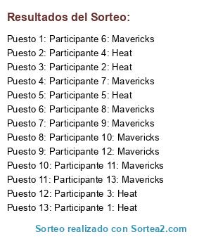 Lista de participantes: Participante 1: Heat, Participante 2: Heat, Participante 3: Heat, Participante 4: Heat, Participante 5: Heat, Participante 6: Mavericks, Participante 7: Mavericks, Participante 8: Mavericks, Participante 9: Mavericks, Participante 10: Mavericks, Participante 11: Mavericks, Participante 12: Mavericks, Participante 13: Mavericks.