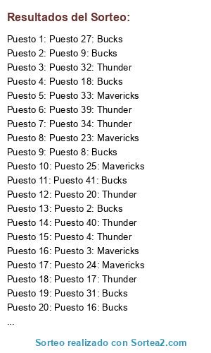 Lista de participantes: Puesto 1: Mavericks, Puesto 2: Bucks, Puesto 3: Mavericks, Puesto 4: Thunder, Puesto 5: Bucks, Puesto 6: Bucks, Puesto 7: Mavericks, Puesto 8: Bucks, Puesto 9: Bucks, Puesto 10: Mavericks, Puesto 11: Thunder, Puesto 12: Mavericks, Puesto 13: Mavericks, Puesto 14: Bucks, Puesto 15: Thunder, Puesto 16: Bucks, Puesto 17: Thunder, Puesto 18: Bucks, Puesto 19: Thunder, Puesto 20: Thunder, Puesto 21: Mavericks, Puesto 22: Bucks, Puesto 23: Mavericks, Puesto 24: Mavericks, Puesto 25: Mavericks, Puesto 26: Bucks, Puesto 27: Bucks, Puesto 28: Thunder, Puesto 29: Mavericks, Puesto 30: Bucks, Puesto 31: Bucks, Puesto 32: Thunder, Puesto 33: Mavericks, Puesto 34: Thunder, Puesto 35: Thunder, Puesto 36: Mavericks, Puesto 37: Bucks, Puesto 38: Thunder, Puesto 39: Thunder, Puesto 40: Thunder, Puesto 41: Bucks.