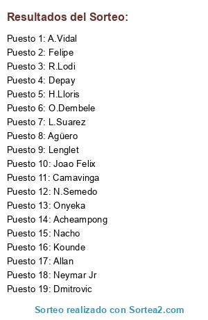Lista de participantes: H.Lloris, Dmitrovic, Kounde, Lenglet, Nacho, N.Semedo, Felipe, R.Lodi, Allan, Onyeka, Camavinga, A.Vidal, Neymar Jr, O.Dembele, Depay, Agüero, L.Suarez, Acheampong, Joao Felix.