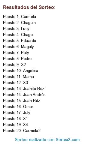 Lista de participantes: July, Carmela, Juanito Rdz, Angelica, Chago, Juan Rdz, Juan Andrés, Pedro, Mamá, Magaly, Eduardo, Paty, Lucy, Omar, Chaguin, Carmela2, X1, X2, X3, X4.