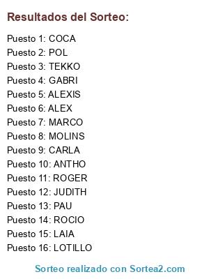 Lista de participantes: GABRI, LAIA, MOLINS, COCA, JUDITH, ROCIO, CARLA, ANTHO, ALEX, POL, TEKKO, PAU, LOTILLO, MARCO, ALEXIS, ROGER.