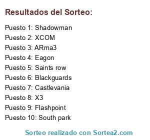Lista de participantes: Saints row, Flashpoint, Eagon, Blackguards, South park, Shadowman, X3, Castlevania, ARma3, XCOM.