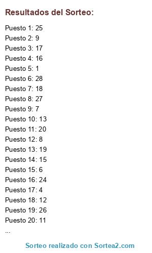 Lista de participantes: 1, 2, 3, 4, 5, 6, 7, 8, 9, 10, 11, 12, 13, 14, 15, 16, 17, 18, 19, 20, 21, 22, 23, 24, 25, 26, 27, 28.