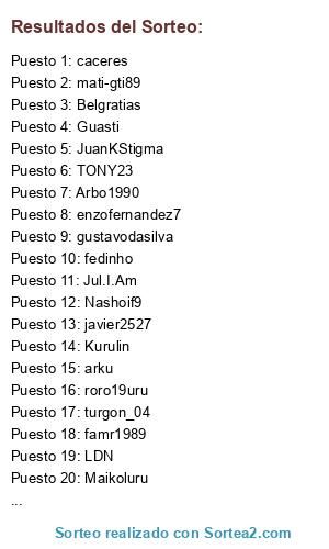 Lista de participantes: Belgratias, famr1989, LDN, enzofernandez7, Cris14, turgon_04, gustavodasilva, arku, javier2527, TONY23, fedinho, Guasti, roro19uru, Arbo1990, JuanKStigma, ANTONIMO, Feliu, Kurulin, Maikoluru, Nashoif9, Jul.I.Am, caceres, chestermg, mati-gti89.