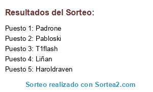 Lista de participantes: Raiven, Luizao, Haroldraven, Er Pollito, Osfranpong, Grindoj, Pabloski, Juanee, Kikote, Cesarito, CArlitros, Bustillo, Yazsegundo, Nugetown, Maxi, Jorge Vialaret, Alex Blanco, SEgo, Betico, Angel, Osdobla, Mardon, Bydavid, Liñan, Iborra, Sullen, Cape, T1flash, Padrone.