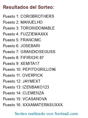 Lista de participantes: MANUELHO, CLEMENZA, TOROINDOMABLE, COROBROTHERS, VCASANOVA, JAYMEXT, IZENBAKO123, XEMITA17, GRANDIOSEGUSS, JOSEBARI, FUZZIEMAXXX, FRANCIMC, FIFIRICHI 87, XXXAMATERASUXXX, OVERPICK, PEPITOGRILLO96.