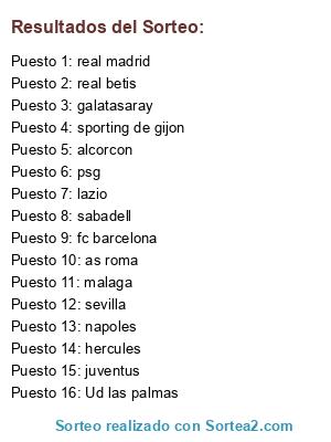 Lista de participantes: alcorcon, as roma, sabadell, fc barcelona, galatasaray, hercules, juventus, malaga, lazio, real betis, real madrid, sevilla, napoles, sporting de gijon, psg, Ud las palmas.