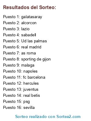 Lista de participantes: alcorcon, as roma, sabadell, fc barcelona, galatasaray, hercules, juventus, malaga, lazio, real betis, real madrid, sevilla, napoles, sporting de gijon, psg, Ud las palmas.