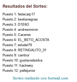 Lista de participantes: EL_BETO_ACOSTA, edudel79, gustavodasilva, andresmoron, cambur, D1E6O, fedecarp17, bestianegraa, RETINGALITO_01, Caceres, hackwey, pellejunior.