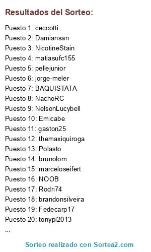 Lista de participantes: MANJATO, jorge-meler, kist2013, Emicabe, gaston25, brandonsilveira, NicotineStain, NachoRC, matiasufc155, brunolom, marceloseifert, NelsonLucybell, Rodri74, themaxiquiroga, NOOB, BAQUISTATA, fitofarais, pablomauro, EZE_RC, Damiansan, pellejunior, Ppe Penta, ceccotti, GonzaloBrito, vitorsfc, Fedecarp17, scayra, tonypl2013, gordocat, Polasto, marianovdm, javibarqui.