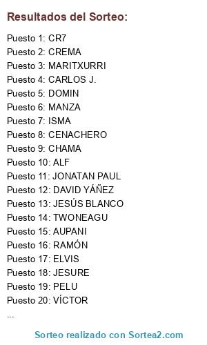 Lista de participantes: ALF, CREMA, DAVE, DAVID, CHAMA, DASANDO, RAULE, JESURE, DAVID YÁÑEZ, TWONEAGU, MARITXURRI, JESÚS BLANCO, ARMANDO, KARPIN, AUPANI, VÍCTOR, ISMA, JOSÉ ENRIQUE, CENACHERO, MANZA, MENA, RAMÓN, ELVIS, DOMIN, CARLOS17, CARLOS J., PELU, BENIHH, CR7, JONATAN PAUL.