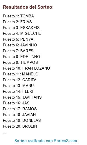 Lista de participantes: BROLIN, JAVI FANS, JORDI, IKERMAN, MIGUECHE, TILILIS, BARESI, PENYA, MANELO, PIPO, RAMOS, JAVINHO, SERGIO HERAS, FRAN LOZANO, FLEKI, CARRIJL, ESKAKEIS, TOMBA, FERNANDO, CARITA, FRIAS, JAS, KILL, MANU, DONBLAS, JAVIAN, EDELINHO, TIEMPOS.