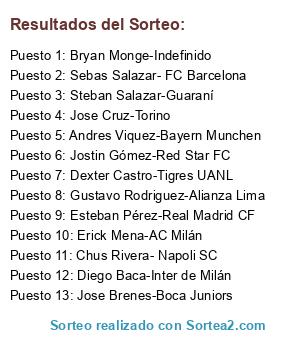 Lista de participantes: Esteban Pérez-Real Madrid CF, Jose Cruz-Torino, Andres Viquez-Bayern Munchen, Jose Brenes-Boca Juniors, Erick Mena-AC Milán, Chus Rivera- Napoli SC, Dexter Castro-Tigres UANL, Steban Salazar-Guaraní, Gustavo Rodriguez-Alianza Lima, Sebas Salazar- FC Barcelona, Diego Baca-Inter de Milán, Jostin Gómez-Red Star FC, Bryan Monge-Indefinido.