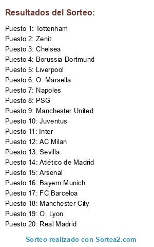 Lista de participantes: Real Madrid, FC Barceloa, Sevilla, Atlético de Madrid, Manchester City, Manchester United, Chelsea, Arsenal, Liverpool, Tottenham, Bayern Munich, Borussia Dortmund, Napoles, AC Milan, Inter, Juventus, O. Marsella, O. Lyon, PSG, Zenit.