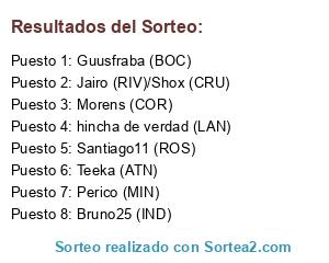 Lista de participantes: Perico (MIN), hincha de verdad (LAN), Santiago11 (ROS), Morens (COR), Bruno25 (IND), Teeka (ATN), Guusfraba (BOC), Jairo (RIV)/Shox (CRU).