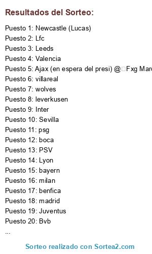 Lista de participantes: madrid, milan, boca, bayern, torino, barcelona, marsella, chelsea, villareal, psg, city, benfica, spurs, wolves, ibiza, Valencia, Juventus, Sevilla, Lfc, Forest(Wfpa), Newcastle (Lucas), Inter, river, leverkusen, Leeds, Bvb, Ajax (en espera del presi) @Fxg Marcofus, PSV, VFB, Lyon.