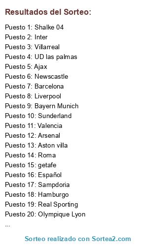 Lista de participantes: Ajax, Arsenal, Aston villa, Atletic Bilbao, Atletico Madrid, Barcelona, Bayer 04, Bayern Munich, Boca Junior, Bor doutmund, Chelsea, Deportivo, Español, Everton, Fiorentina, galatasaray, getafe, Hamburgo, Inter, Leeds united, Liverpool, Malaga, Manchester city, Milan, Napoli, Newscastle, Olympiakos, Olympique Lyon, Oporto, Panathinaikos, Psg, PSV, Rayo Vallecano, Real Madrid, Real Sociedad, Real Sporting, Roma, Sampdoria, sevilla, Shalke 04, Sporting CP, Spurs, Stuttgart, Sunderland, UD las palmas, Udinese, Valencia, Villarreal, Werder Bremen, Wolfsburg.