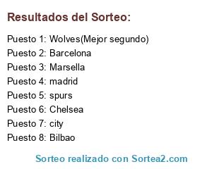Lista de participantes: spurs, madrid, Bilbao, city, Barcelona, Chelsea, Marsella, Wolves(Mejor segundo).