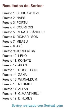 Lista de participantes: COURTOIS, LENO, AKANJI, KONATE, AKÉ, JORDI ALBA, MBABU, ROUSILLON, HAPS, RENATO SÁNCHEZ, WIJNALDUM, ALLAN, S.CHUKWUEZE, G.MARTINELLI, NKUNKU, ZAHA, RICHARLISON, D.NERES, PORTU.
