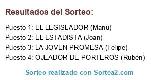 Lista de participantes: LA JOVEN PROMESA (Felipe), OJEADOR DE PORTEROS (Rubén), EL LEGISLADOR (Manu), EL ESTADISTA (Joan).
