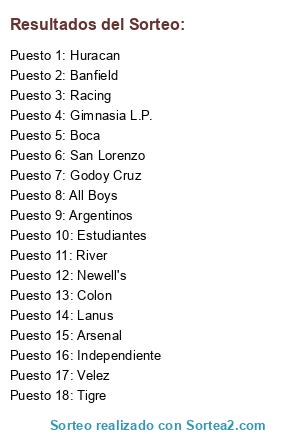 Lista de participantes: Lanus, Huracan, All Boys, Banfield, River, Estudiantes, Colon, Independiente, Gimnasia L.P., Velez, San Lorenzo, Boca, Argentinos, Newell's, Arsenal, Godoy Cruz, Racing, Tigre.