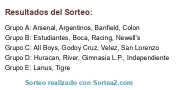 Lista de participantes: Lanus, Velez, San Lorenzo, Boca, Argentinos, Newell's, Arsenal, Godoy Cruz, Racing, Tigre, Huracan, All Boys, Banfield, River, Estudiantes, Colon, Independiente, Gimnasia L.P..