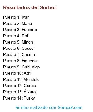 Lista de participantes: Figueiras, Couce, Chema, Gabi Vigo, Miñon, Adri, Fulberto, Álvaro, Carlos, Tusky, Manu, Iván, Mondelo, Roi.