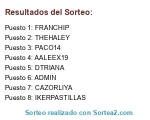 Lista de participantes: DTRIANA, FRANCHIP, IKERPASTILLAS, ADMIN, THEHALEY, AALEEX19, PACO14, CAZORLIYA.