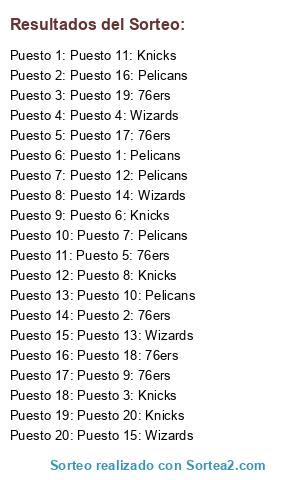 Lista de participantes: Puesto 1: Pelicans, Puesto 2: 76ers, Puesto 3: Knicks, Puesto 4: Wizards, Puesto 5: 76ers, Puesto 6: Knicks, Puesto 7: Pelicans, Puesto 8: Knicks, Puesto 9: 76ers, Puesto 10: Pelicans, Puesto 11: Knicks, Puesto 12: Pelicans, Puesto 13: Wizards, Puesto 14: Wizards, Puesto 15: Wizards, Puesto 16: Pelicans, Puesto 17: 76ers, Puesto 18: 76ers, Puesto 19: 76ers, Puesto 20: Knicks.