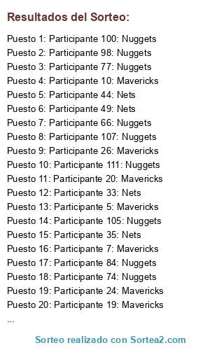 Lista de participantes: Participante 1: Mavericks, Participante 2: Mavericks, Participante 3: Mavericks, Participante 4: Mavericks, Participante 5: Mavericks, Participante 6: Mavericks, Participante 7: Mavericks, Participante 8: Mavericks, Participante 9: Mavericks, Participante 10: Mavericks, Participante 11: Mavericks, Participante 12: Mavericks, Participante 13: Mavericks, Participante 14: Mavericks, Participante 15: Mavericks, Participante 16: Mavericks, Participante 17: Mavericks, Participante 18: Mavericks, Participante 19: Mavericks, Participante 20: Mavericks, Participante 21: Mavericks, Participante 22: Mavericks, Participante 23: Mavericks, Participante 24: Mavericks, Participante 25: Mavericks, Participante 26: Mavericks, Participante 27: Nets, Participante 28: Nets, Participante 29: Nets, Participante 30: Nets, Participante 31: Nets, Participante 32: Nets, Participante 33: Nets, Participante 34: Nets, Participante 35: Nets, Participante 36: Nets, Participante 37: Nets, Participante 38: Nets, Participante 39: Nets, Participante 40: Nets, Participante 41: Nets, Participante 42: Nets, Participante 43: Nets, Participante 44: Nets, Participante 45: Nets, Participante 46: Nets, Participante 47: Nets, Participante 48: Nets, Participante 49: Nets, Participante 50: Nets, Participante 51: Nets, Participante 52: Nets, Participante 53: Nets, Participante 54: Nets, Participante 55: Nets, Participante 56: Nets, Participante 57: Nets, Participante 58: Nets, Participante 59: Nets, Participante 60: Nets, Participante 61: Nets, Participante 62: Nuggets, Participante 63: Nuggets, Participante 64: Nuggets, Participante 65: Nuggets, Participante 66: Nuggets, Participante 67: Nuggets, Participante 68: Nuggets, Participante 69: Nuggets, Participante 70: Nuggets, Participante 71: Nuggets, Participante 72: Nuggets, Participante 73: Nuggets, Participante 74: Nuggets, Participante 75: Nuggets, Participante 76: Nuggets, Participante 77: Nuggets, Participante 78: Nuggets, Participante 79: Nuggets, Participante 80: Nuggets, Participante 81: Nuggets, Participante 82: Nuggets, Participante 83: Nuggets, Participante 84: Nuggets, Participante 85: Nuggets, Participante 86: Nuggets, Participante 87: Nuggets, Participante 88: Nuggets, Participante 89: Nuggets, Participante 90: Nuggets, Participante 91: Nuggets, Participante 92: Nuggets, Participante 93: Nuggets, Participante 94: Nuggets, Participante 95: Nuggets, Participante 96: Nuggets, Participante 97: Nuggets, Participante 98: Nuggets, Participante 99: Nuggets, Participante 100: Nuggets, Participante 101: Nuggets, Participante 102: Nuggets, Participante 103: Nuggets, Participante 104: Nuggets, Participante 105: Nuggets, Participante 106: Nuggets, Participante 107: Nuggets, Participante 108: Nuggets, Participante 109: Nuggets, Participante 110: Nuggets, Participante 111: Nuggets, Participante 112: Nuggets, Participante 113: Nuggets, Participante 114: Nuggets.
