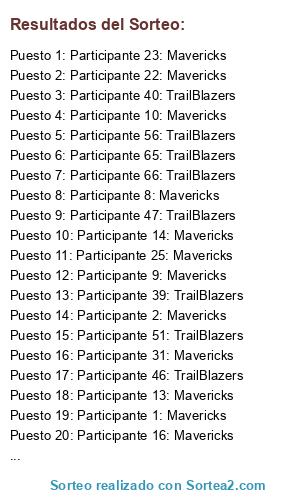 Lista de participantes: Participante 1: Mavericks, Participante 2: Mavericks, Participante 3: Mavericks, Participante 4: Mavericks, Participante 5: Mavericks, Participante 6: Mavericks, Participante 7: Mavericks, Participante 8: Mavericks, Participante 9: Mavericks, Participante 10: Mavericks, Participante 11: Mavericks, Participante 12: Mavericks, Participante 13: Mavericks, Participante 14: Mavericks, Participante 15: Mavericks, Participante 16: Mavericks, Participante 17: Mavericks, Participante 18: Mavericks, Participante 19: Mavericks, Participante 20: Mavericks, Participante 21: Mavericks, Participante 22: Mavericks, Participante 23: Mavericks, Participante 24: Mavericks, Participante 25: Mavericks, Participante 26: Mavericks, Participante 27: Mavericks, Participante 28: Mavericks, Participante 29: Mavericks, Participante 30: Mavericks, Participante 31: Mavericks, Participante 32: Mavericks, Participante 33: Mavericks, Participante 34: Mavericks, Participante 35: Mavericks, Participante 36: Mavericks, Participante 37: Mavericks, Participante 38: Mavericks, Participante 39: TrailBlazers, Participante 40: TrailBlazers, Participante 41: TrailBlazers, Participante 42: TrailBlazers, Participante 43: TrailBlazers, Participante 44: TrailBlazers, Participante 45: TrailBlazers, Participante 46: TrailBlazers, Participante 47: TrailBlazers, Participante 48: TrailBlazers, Participante 49: TrailBlazers, Participante 50: TrailBlazers, Participante 51: TrailBlazers, Participante 52: TrailBlazers, Participante 53: TrailBlazers, Participante 54: TrailBlazers, Participante 55: TrailBlazers, Participante 56: TrailBlazers, Participante 57: TrailBlazers, Participante 58: TrailBlazers, Participante 59: TrailBlazers, Participante 60: TrailBlazers, Participante 61: TrailBlazers, Participante 62: TrailBlazers, Participante 63: TrailBlazers, Participante 64: TrailBlazers, Participante 65: TrailBlazers, Participante 66: TrailBlazers, Participante 67: TrailBlazers, Participante 68: TrailBlazers, Participante 69: TrailBlazers.