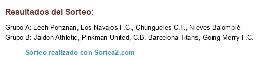 Lista de participantes: C.B. Barcelona Titans, Pinkman United, Chungueles C.F., Los Navajos F.C., Going Merry F.C., Nieves Balompié, Lech Ponznan, Jaldon Athletic.