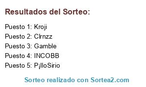 Lista de participantes: MisterMozo, ed_jb88, ChuckH8, Googol, Shinji Mimura, jazcks, Macre, M432, Franisco, iTroNk.x360, INCOBB, Choso, Therman, Lacatus, CRT, koljaiczek, aarongutierrez, Soberano, ArchOS_bEST, Trinschuke, Incoñito, albarito17, Darkmark5, Bubo, Ehldair, JONii, gh0stwir3s, umer, .Bender, IOK-1, BadBunny, AlexNomas, mr_gus, ElRuti, lightct, DrAlpha, Judiodas, Jaexor, Zande, Pablo1402, Liger, Asgrard, [MaRDuK], Omalley17, P¡lloSirio, roly82, Señor-X, Gamble, mipolla, JDJorge99, AspirinaC, greki, polito13, Seigram, Donzap, Jim Stark, El Mago, monthyp, Garra Negra, Louiss01, Kraux, Tagardino, dadits, gorrinch, EvaR, sahalapaha, XxDavicinxX, gedo, Vaporycannon, Robe24, Kukarachu, OniShiro, DonSampe, o0firestarter0o, El_Montaraz, Sporax, Spiderdown, Guniko, Jlc218, Sabrosillo, Patillas, IoriYagami24, Karvon, El Cubi, Alcanor, Ecuánime, Canihop, xose92, Wren, Raymaker, Barruso, carloskis, gotmog, BIGMOUTH, campaymari, ElMataviejas, Pedolti, Jesse_Pinkman, CID Abascal, 1_Epsilon_1, trane, Varda, Esquilax, dante1783, Andres_age, jdestroykh, augernwf, Tomoso, Kroji, Luis Padrique, Mr Jacko, avega, 7eirsu, Eihwaz, Faaka, NeoZerox, Bösen, danism92, Stikermen, Rubiasosare, meka55ll, Stevdan, Hollow, Boke MLG, asm, DBL, Oksydo, Grumo, Saulo_Stark, Zotck, Weeping_Angel, mercucho1, TRomano, kickboxer_88, IlMostro, Fary Torito, Baper, Jorgeche, ongayo, Rocking, Clrnzz, EXDURO, Swallow, arXen, adrii93, lledooliver.