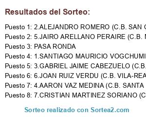 Lista de participantes: 1.SANTIAGO MAURICIO VOGCHUMIAN AMORIN (C.B. PINEL), 2.ALEJANDRO ROMERO (C.B. SAN CRISTOBAL), 3.GABRIEL JAIME CABEZUELO (C.B. SEDAVI), 4.AARON VAZ MEDINA (C.B. SANTA POLA), 5.JAIRO ARELLANO PERAIRE (C.B. MARTINEZ), 6.JOAN RUIZ VERDU (C.B. VILA-REAL), 7.CRISTIAN MARTINEZ SORIANO (C.B. LA FAMILIA), PASA RONDA.