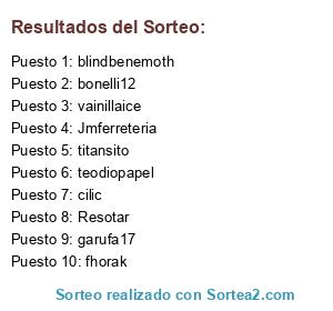 Lista de participantes: teodiopapel, vainillaice, titansito, garufa17, fhorak, bonelli12, cilic, blindbenemoth, Jmferreteria, Resotar.