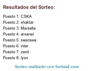 Lista de participantes: arsenal, shaktar, lyon, inter, CSKA, Marsella, swansea, zenit.