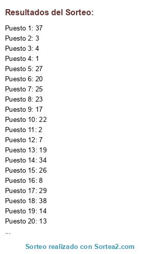 Lista de participantes: 1, 2, 3, 4, 5, 6, 7, 8, 9, 10, 11, 12, 13, 14, 15, 16, 17, 18, 19, 20, 21, 22, 23, 24, 25, 26, 27, 28, 29, 30, 31, 32, 33, 34, 35, 36, 37, 38.