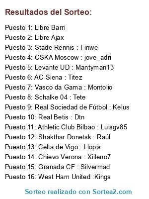 Lista de participantes: AC Siena : Titez, Granada CF : Silvermad, Schalke 04 : Tete, Celta de Vigo : Llopis, Athletic Club Bilbao : Luisgv85, Libre Ajax, Real Sociedad de Fútbol : Kelus, Libre Barri, West Ham United :Kings, Stade Rennis : Finwe, Real Betis : Dtn, Chievo Verona : Xiileno7, CSKA Moscow : jove_adri, Shakthar Donetsk : Raúl, Vasco da Gama : Montolio, Levante UD : Mantyman13.