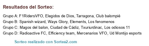 Lista de participantes: Elements, Los odiosos 11, F1RidersVFO, Ud Montijo esports, Club balompié, Ciudad de Cádiz, Ways Glory, Tarragona, Mercenarios VFO, Los fenomenos, Efficiency team, Spanish wizard, Elegidos de Dios, Txuriurdinac, Radioactive FC, Magos del balon.
