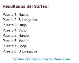 Lista de participantes: Hugo, Nacho, Nando, Víctor, Martín, D Lorigados, B Lorigados, Borja.